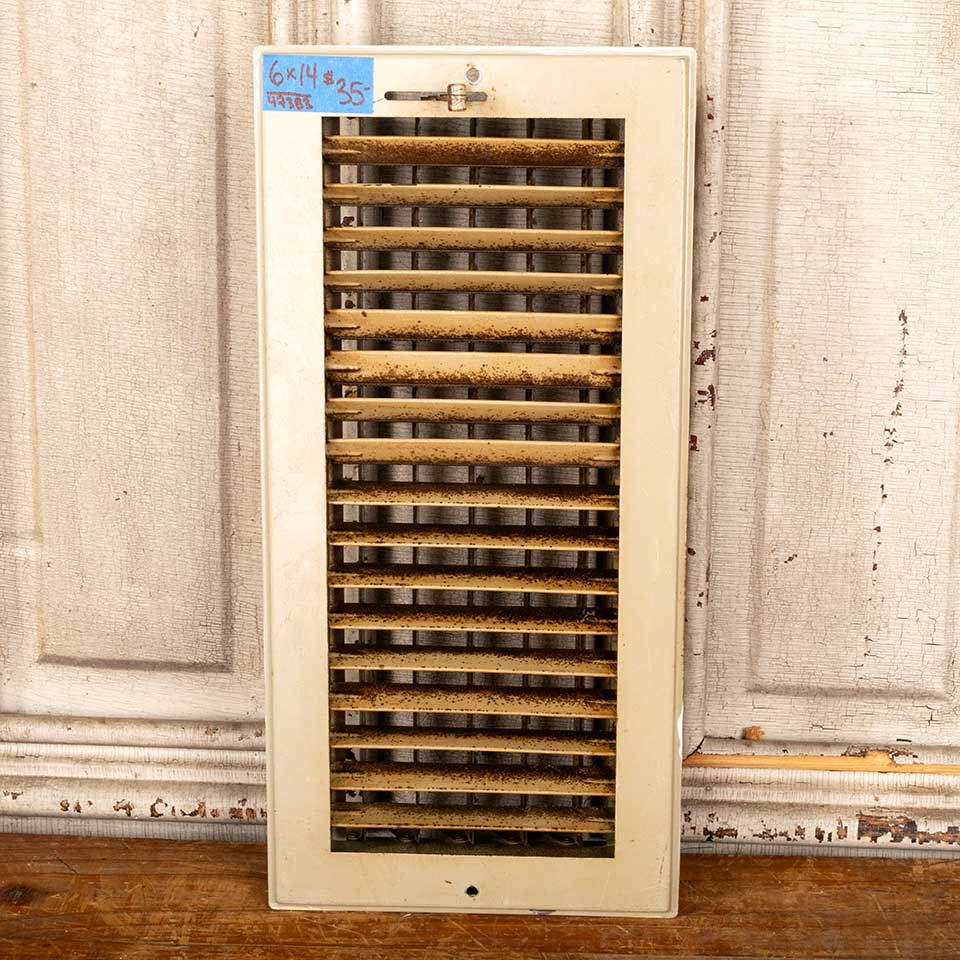 Architectural salvage metal heat grate register vent cover with operable louvers measuring approx. 5 11/16" x 13 9/16" (insert dimensions) and 7 1/2" x 15 1/2" (overall dimensions). See photos to evaluate condition.