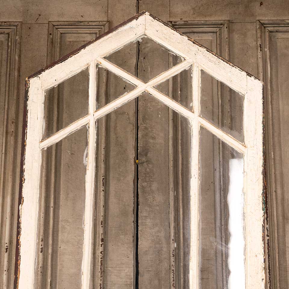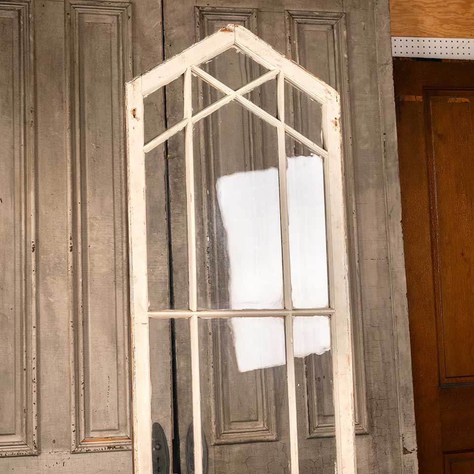 Architectural salvage antique pointed arch divided lite wood window measuring approx. 23 3/4" wide x 86 3/4" tall (at peak) x 1 3/8" thick. See photos to evaluate condition.
