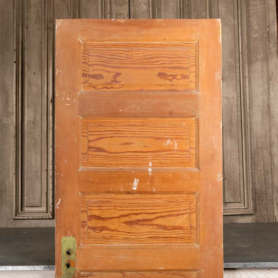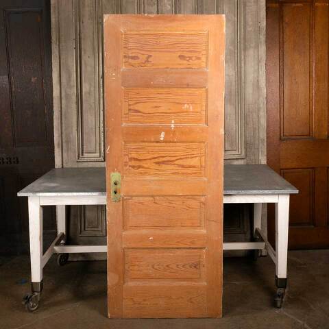 Architectural salvage antique five horizontal panel pine wood interior door measuring approx. 29 3/4" wide x 76 7/8" tall x 1 3/8" thick. The paint has been stripped off one side. See photos to evaluate condition.