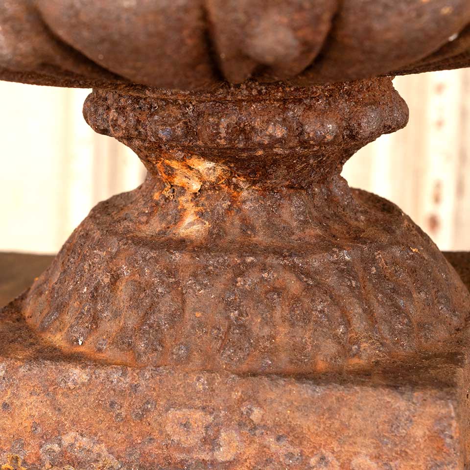 Architectural salvage rusty cast iron garden planter urn measuring approx. 11" in diameter x 7 1/2" tall with a 4 1/2" square base. Color and condition may vary, see photos to evaluate. Priced at $195/each.