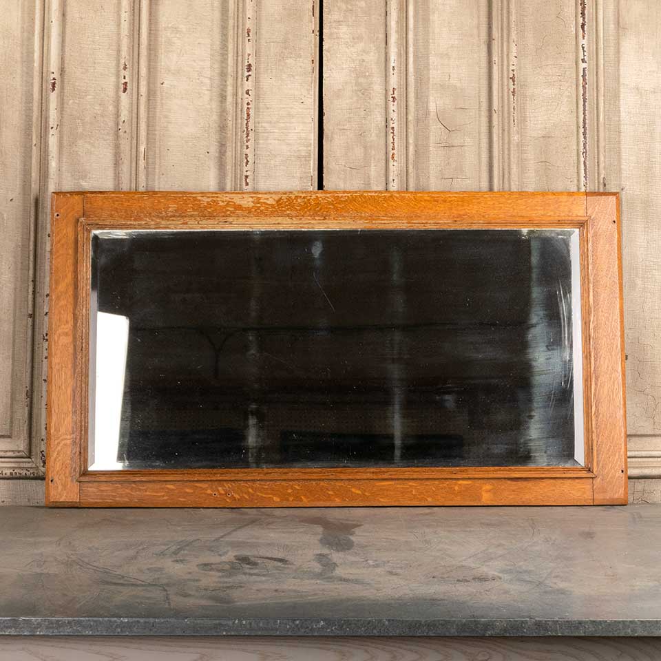 Architectural salvage antique beveled glass mirror in oak frame measuring approx. 41 5/16" x 22 5/8" x 1 1/2" front to back. See photos to evaluate condition.
