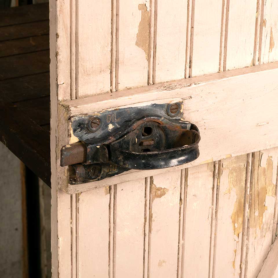 Architectural salvage antique painted wood beadboard barn door with hardware measuring approx. 31 7/8" wide x 71 1/4" tall x 1 7/8" front to back. See photos to evaluate condition.
