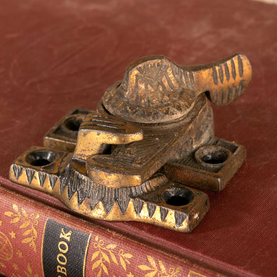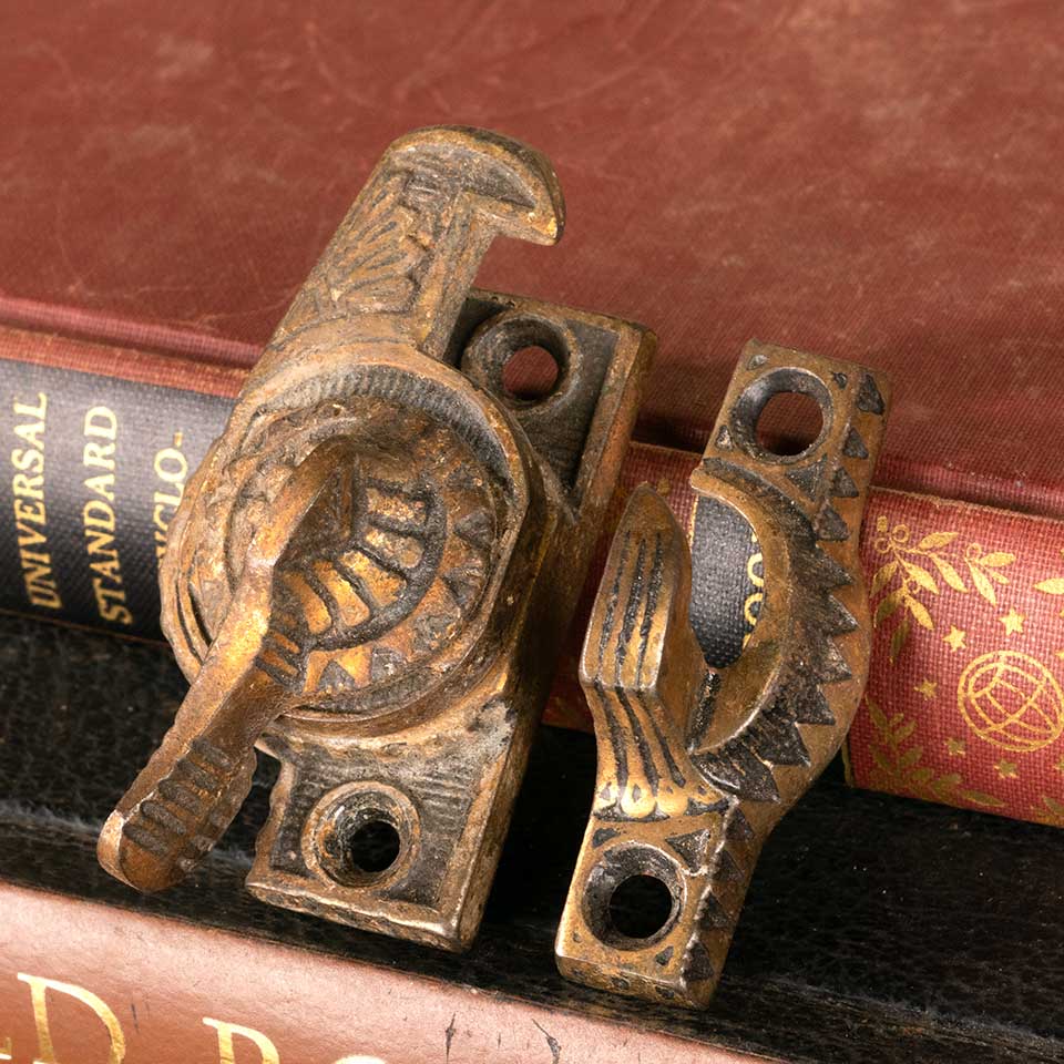 Architectural salvage antique operable cast iron Victorian double hung window sash lock and keeper hardware set with sundial motif . The lock measures approx. 2 1/2" wide x 1" tall x 1 1/4" front to back and the keeper 2" wide x 3/4" tall x 5/8" front to back. Color and condition may vary, see photos to evaluate. Priced at $40/each.