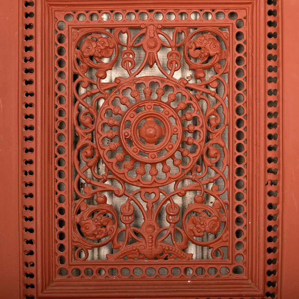 Architectural salvage antique cast iron fireplace summer front cover measuring approx. 20" wide x 27 1/8" tall x 1" front to back. See photos to evaluate condition.
