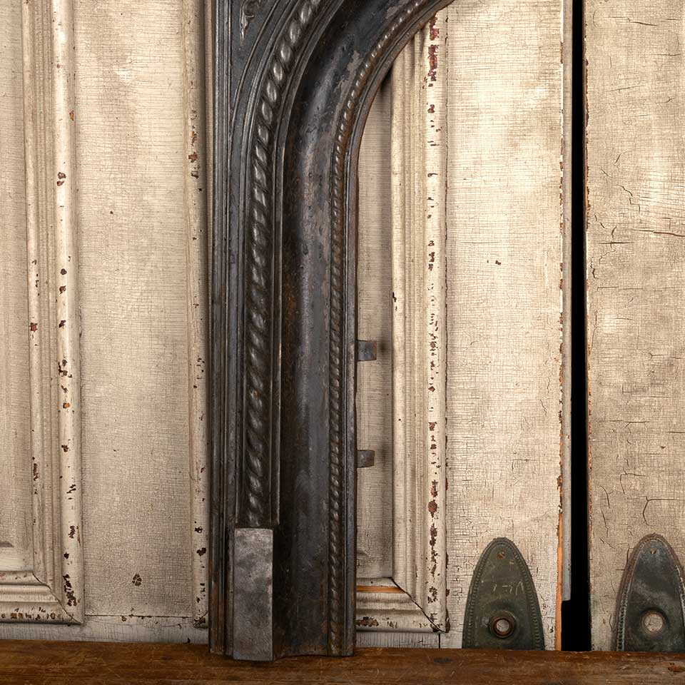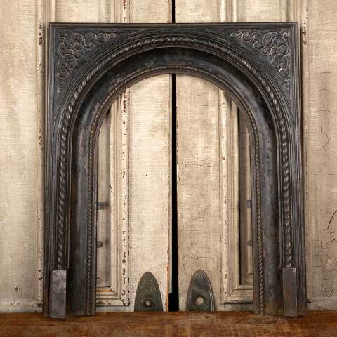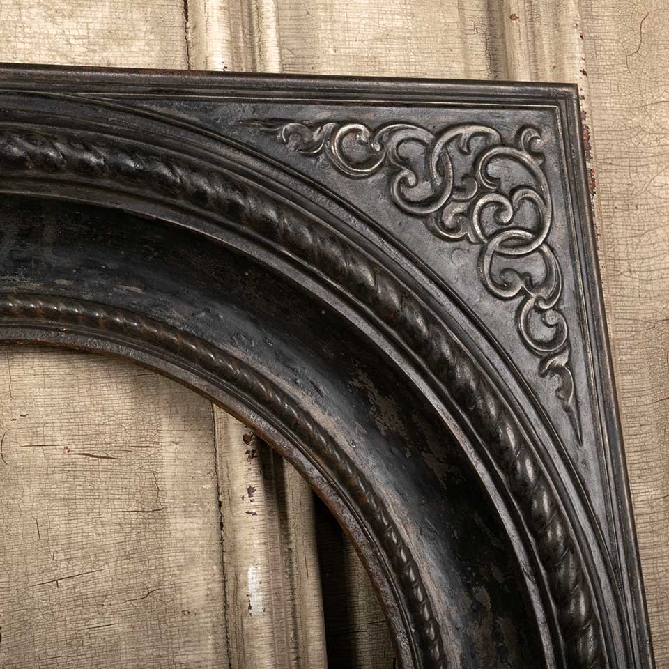 Architectural salvage antique cast iron fireplace surround with arched top firebox opening measuring approx. 26 1/4" wide x 30 1/2" tall x 2" front to back. The interior firebox opening measures approx. 16 3/8" wide x 25 3/8" tall. See photos to evaluate condition.