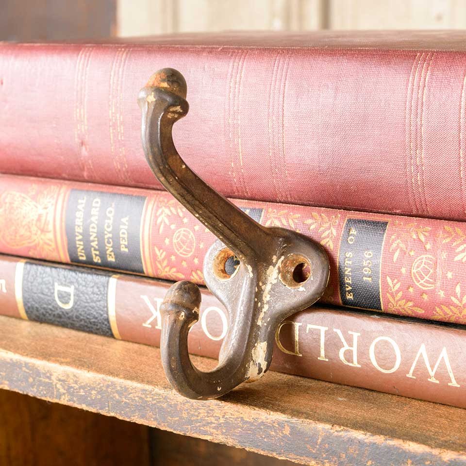 Architectural salvage antique cast iron double acorn finial coat and hat hook hardware measuring approx. 1 3/4" wide x 3" tall x 2 7/8" front to back. Color and condition may vary.