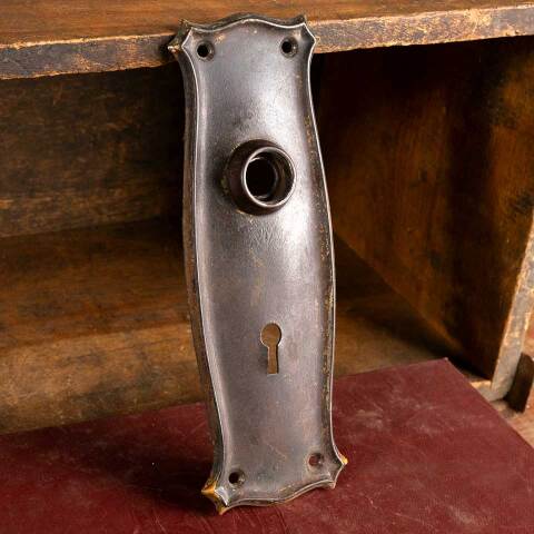 Architectural salvage antique steel Arts & Crafts doorknob backplate hardware measuring approx. 2 3/8" wide x 6 7/8" tall with a 3/4" diameter collar. The spindle and keyhole measure 2 1/2" on centers. Condition and color may vary, see photos to evaluate. Priced at $25/each.