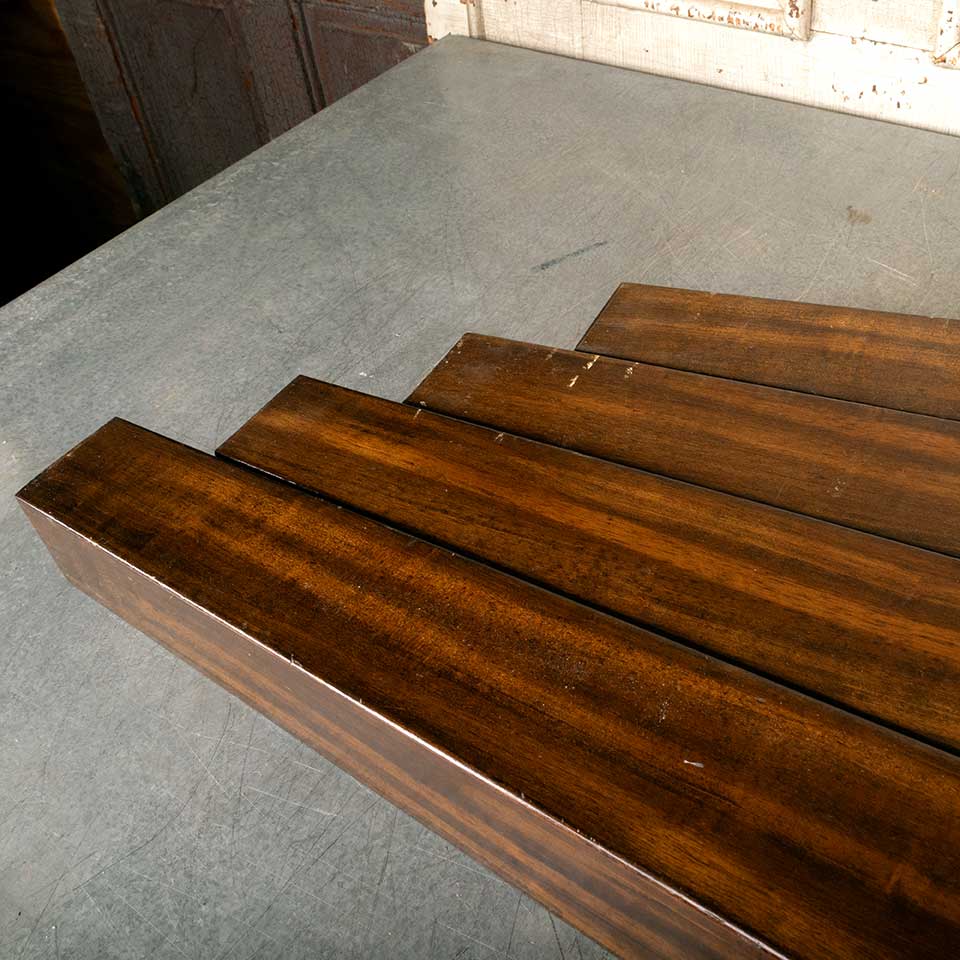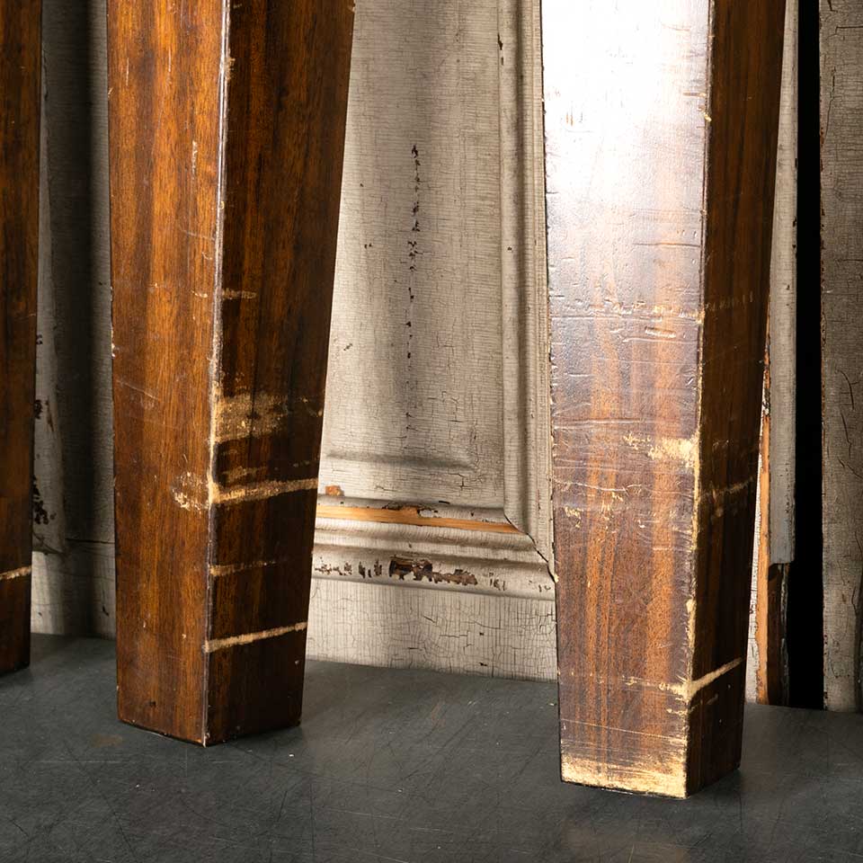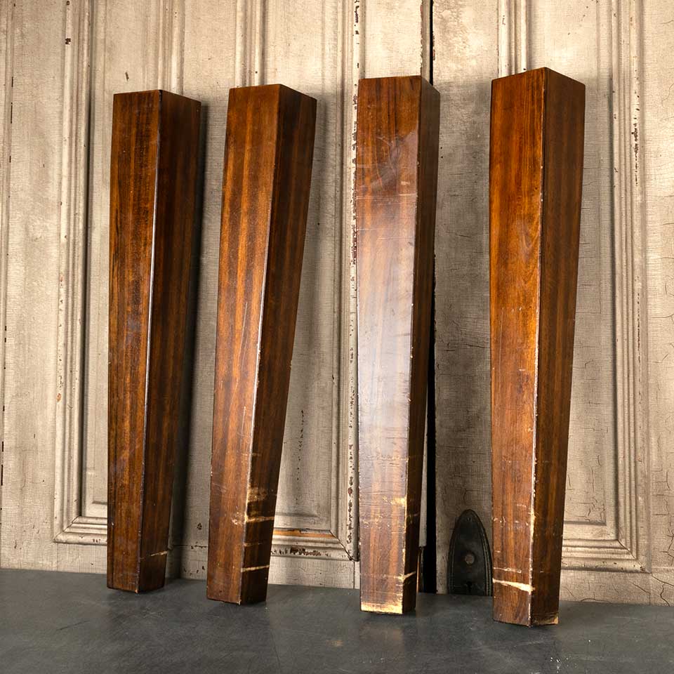 Salvaged tapered wood table legs each measuring approx. 35 1/8" tall with a 4 1/2" square top and 3" square base. See photos to evaluate condition. Priced at $175 for the set.