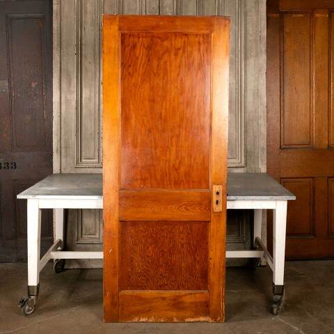 Architectural salvage antique two panel pine interior door with mortise lock measuring approx. 31 15/16" wide x 78 3/4" tall x 1 3/8" thick thick. There's material loss along the bottom of the door. See photos to evaluate condition.