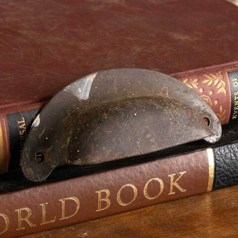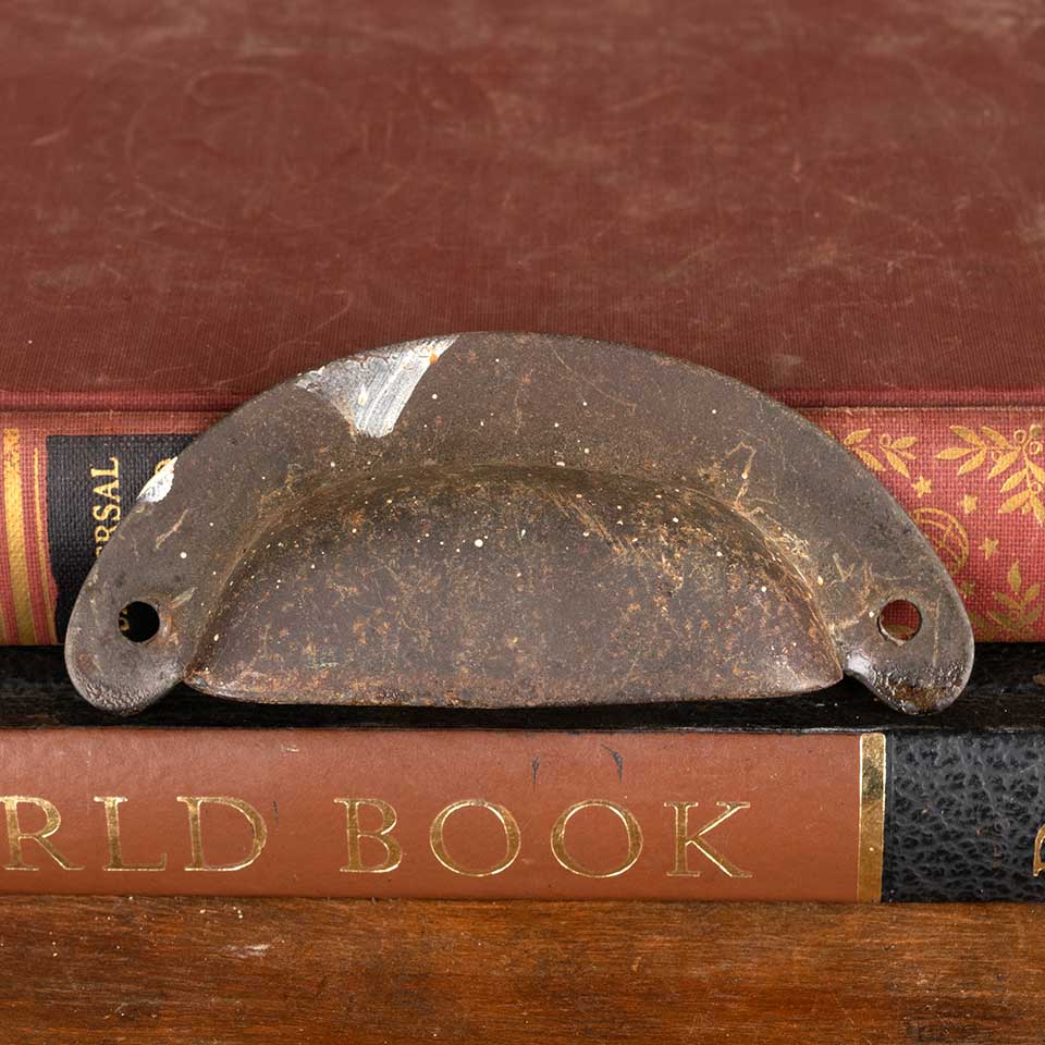 Architectural salvage antique metal apothecary card catalog drawer bin pull furniture hardware measuring approx. 3 3/4" wide x 1 1/2" tall x 3/4" front to back with mounting holes 3 1/4" on centers. Color and condition may vary, see photos to evaluate. Priced at $12/each.