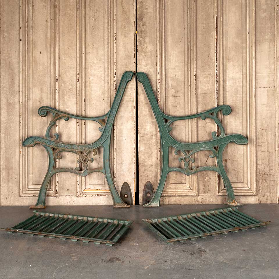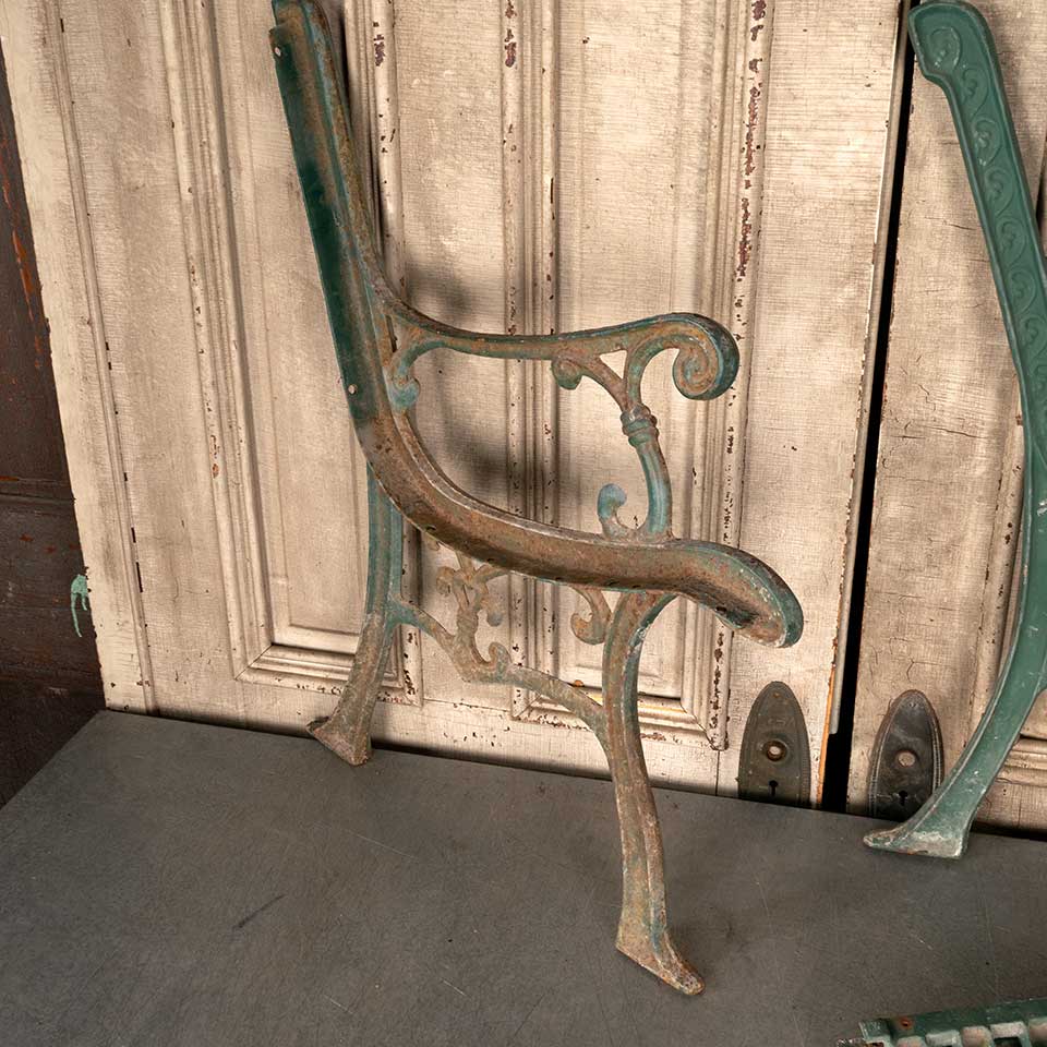 Pair of architectural salvage cast iron garden / park bench ends each measuring approx. 1" wide x 32 1/2" tall x 23 1/2" front to back. The set includes two slatted metal back pieces. See photos to evaluate condition. Priced at $150 for the set.