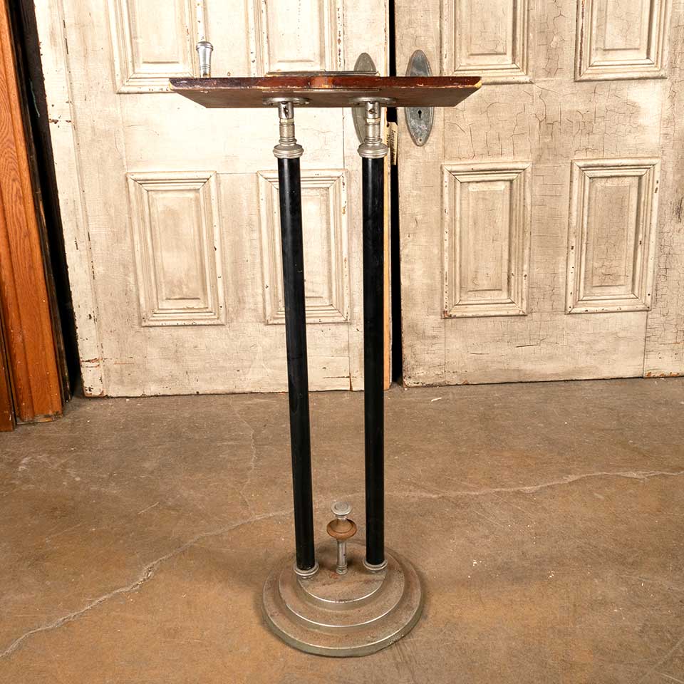 Architectural salvage antique metal and wood reception registration podium stand with pen holder measuring approx. 18" wide x 44 1/2" tall x 14" front to back with a 13 1/2" diameter base. There's some veneer loss on the top. See photos to evaluate condition.