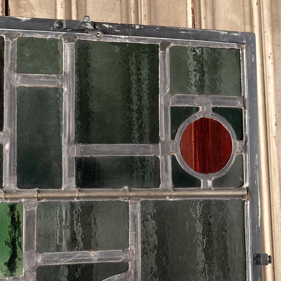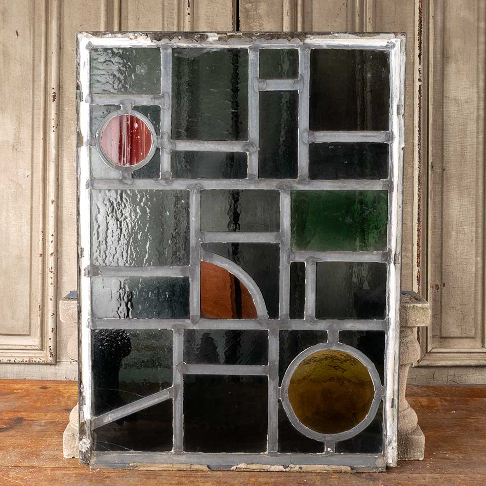 Architectural salvage vintage mid-century modern stained glass window panel with rondels measuring approx. 23 1/4" wide x 31" tall x 3/4" thick. There are two cracked panes. See photos to evaluate condition.