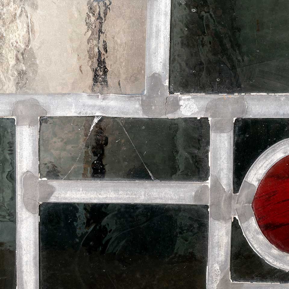 Architectural salvage vintage mid-century modern stained glass window panel with rondels measuring approx. 23 1/4" wide x 31" tall x 3/4" thick. There are two cracked panes. See photos to evaluate condition.