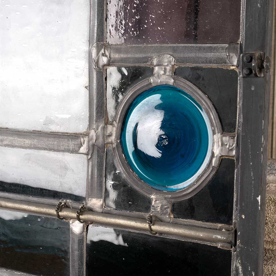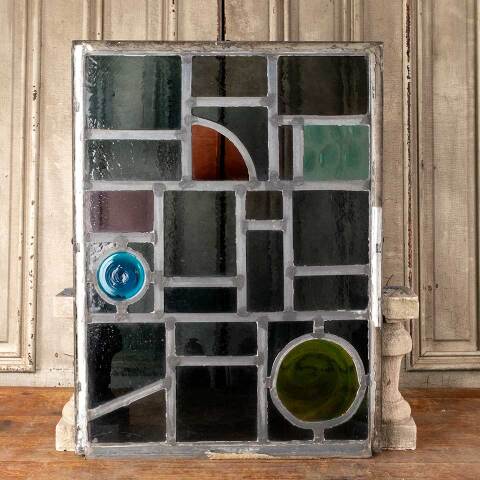 Architectural salvage vintage mid-century modern stained glass window panel with rondels measuring approx. 23 1/4" wide x 31" tall x 3/4" thick. There's one cracked pane. See photos to evaluate condition.