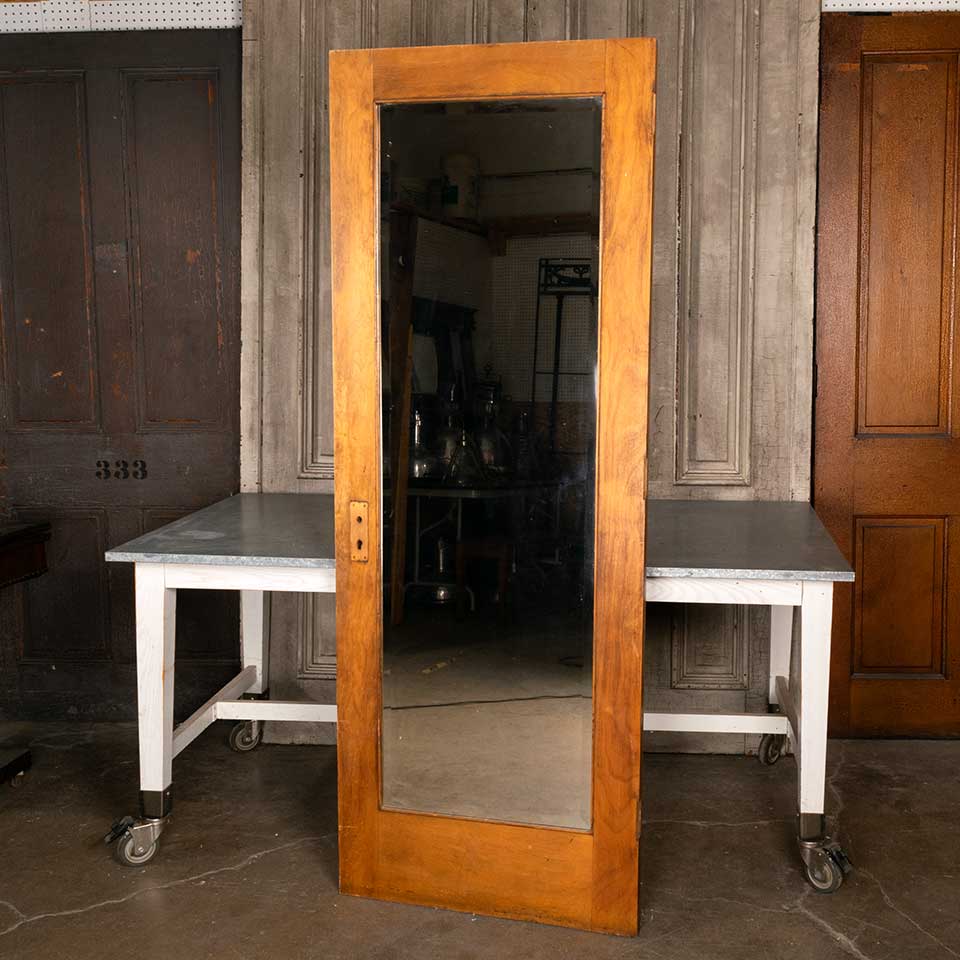 Architectural salvage antique two panel wood interior door with beveled glass mirror and mortise lock measuring approx. 29 5/8" wide x 79 1/2" tall x 1 3/4" thick. See photos to evaluate condition.