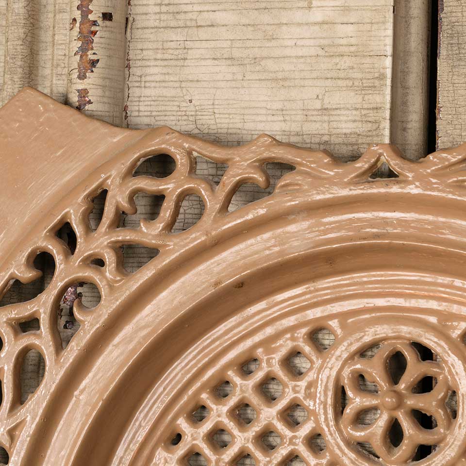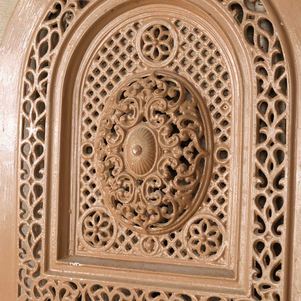 Architectural salvage antique ornate arched top painted cast iron fireplace summer front cover measuring approx. 18 7/8" wide x 25" tall x 2" front to back. A large section of the top is missing. See photos to evaluate condition.