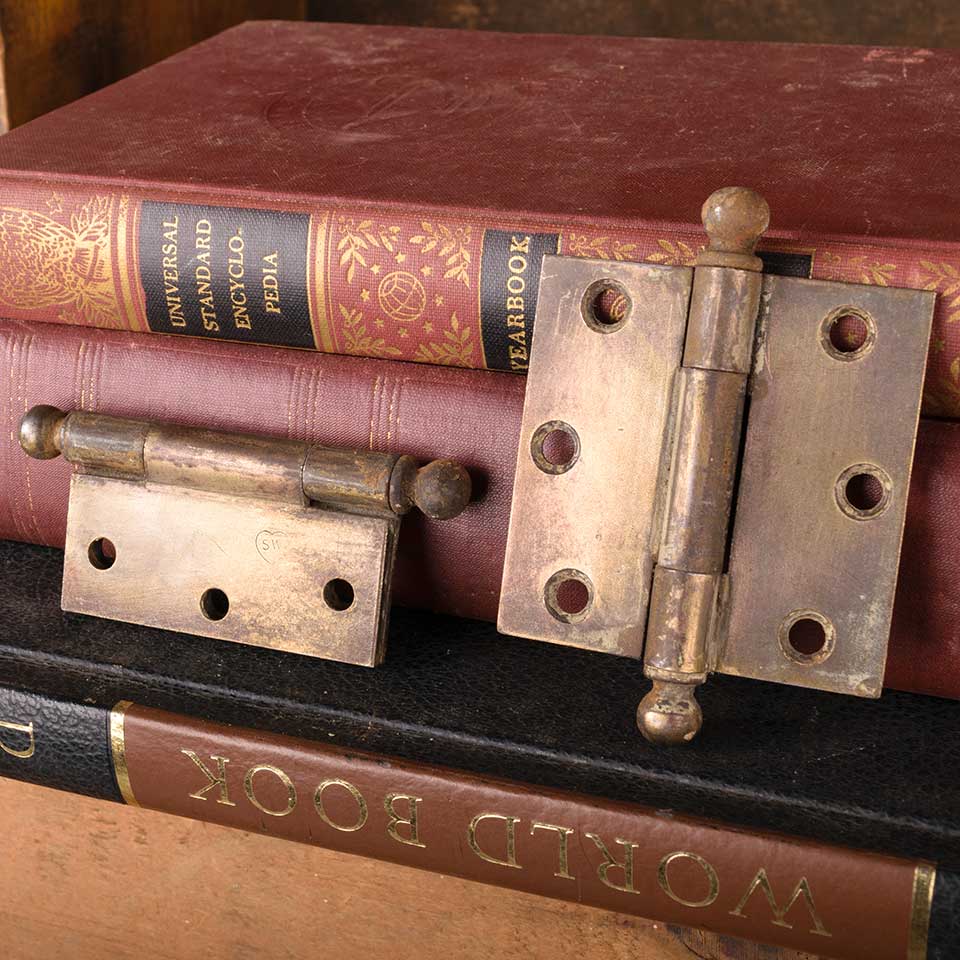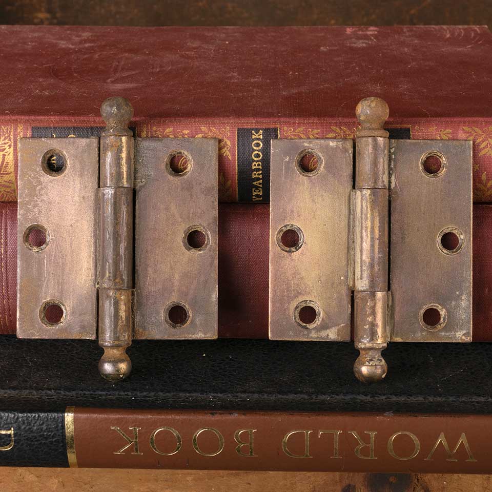 Pair of architectural salvage antique Stanley Sweetheart plated steel ball finial interior door or furniture butt hinges each measuring approx. 2 1/2" squared (3 1/2" tall overall including finials). See photos to evaluate condition. Priced at $20 for the pair.