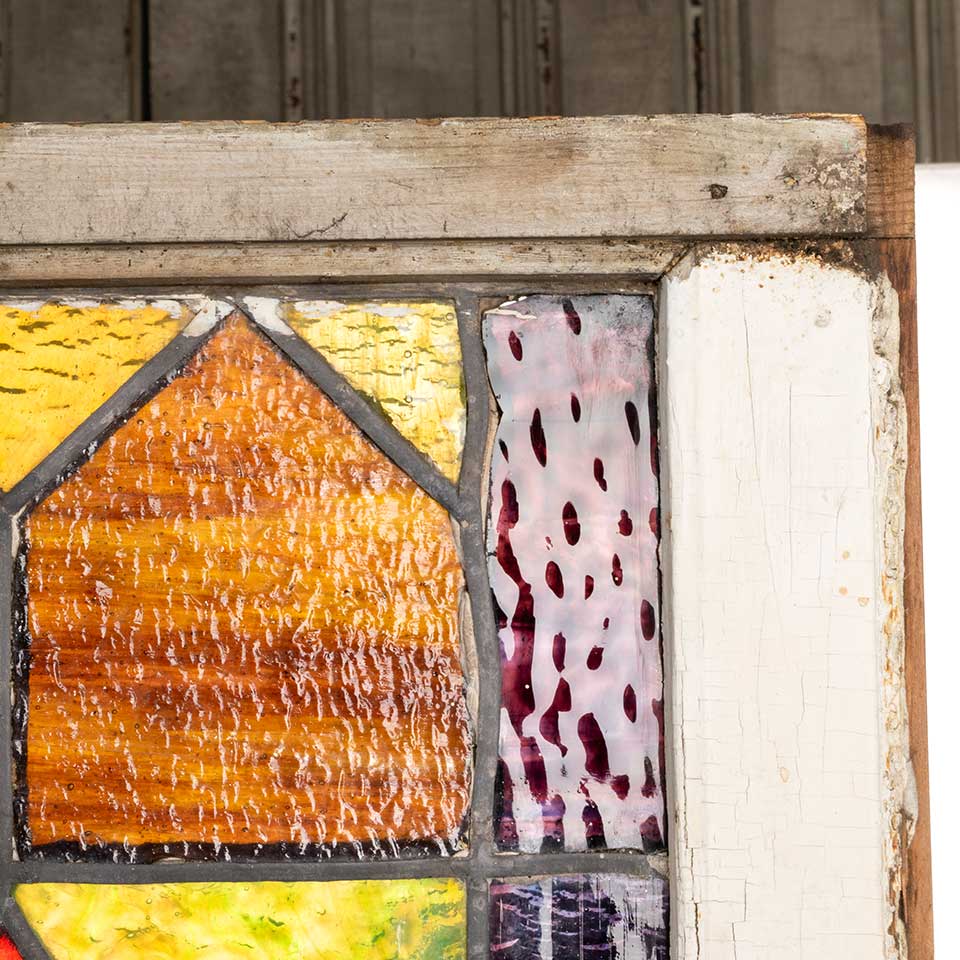 Architectural salvage antique stained glass window in wood sash frame measuring approx. 23 3/4" wide x 19 3/4" tall x 1 3/8" thick. Some of the panes are cracked. See photos to evaluate condition.