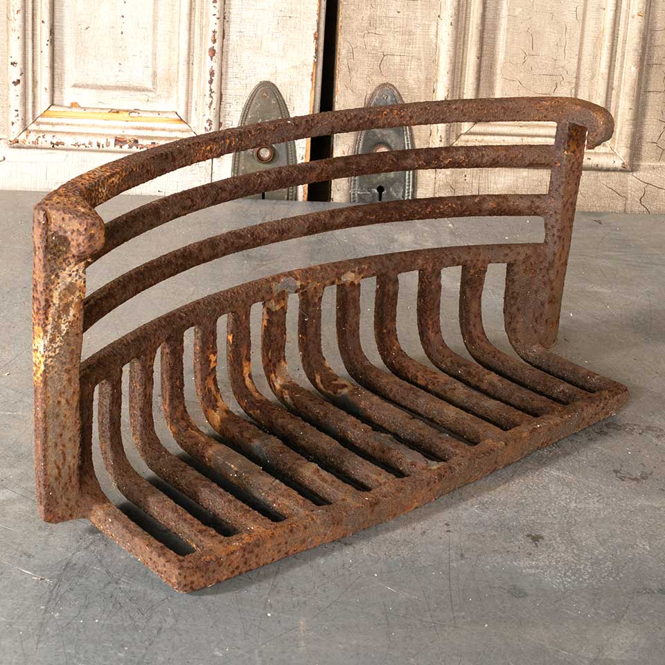 Architectural salvage antique cast iron hanging fireplace coal basket grate / log holder with curved front measuring approx. 20 1/2" wide x 9 3/8" tall x 8" front to back (overall dimensions). See photos to evaluate condition.