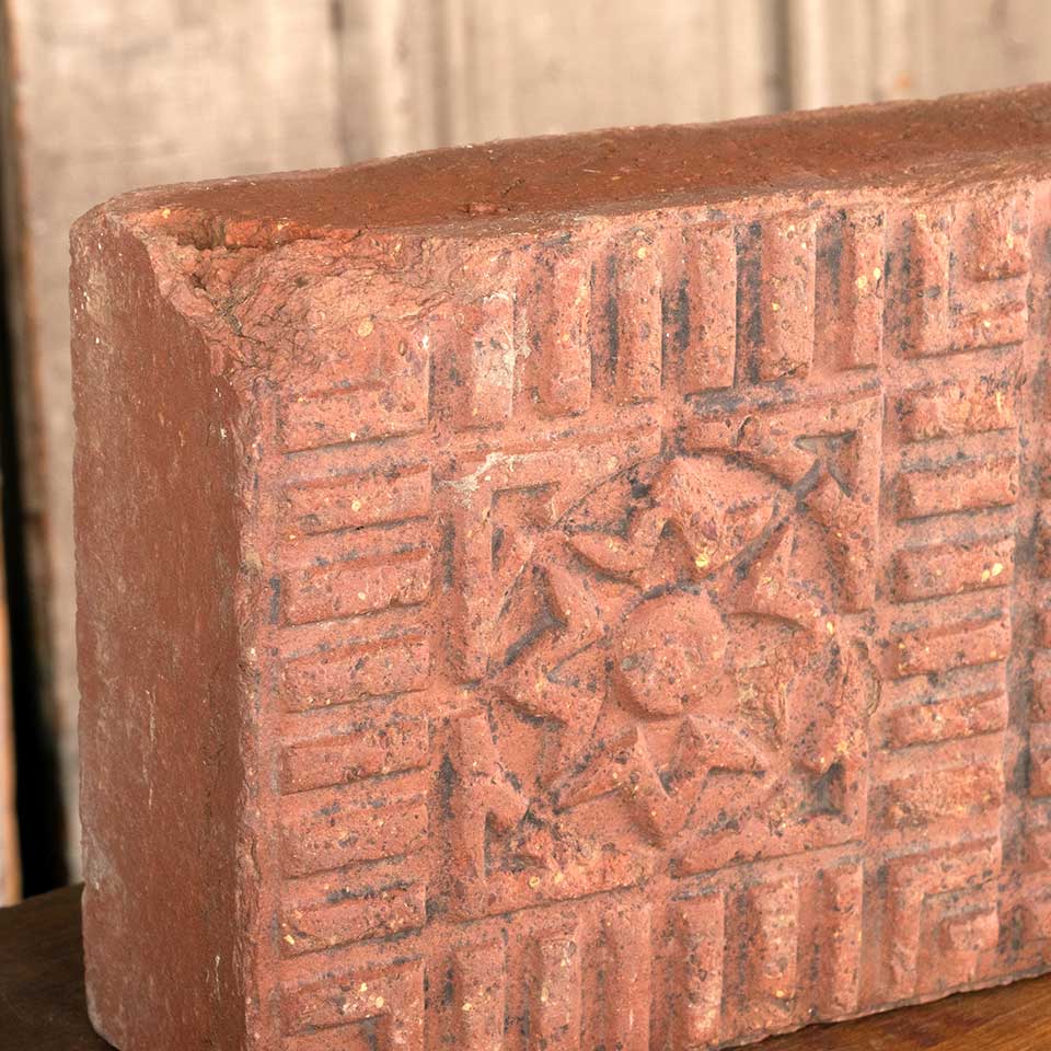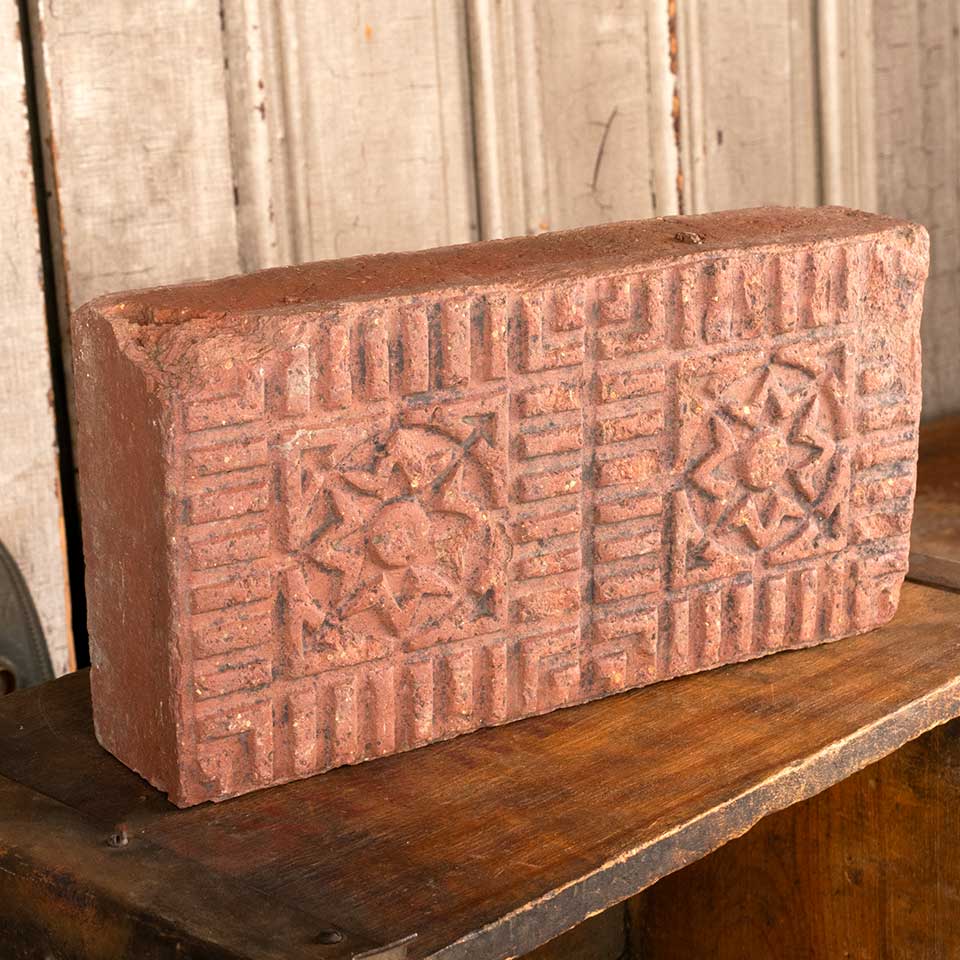 Architectural salvage antique salt glazed flower pattern sidewalk paver measuring each approx. 5" x 10" x 2 1/2" tall. Color and condition vary. Priced at $15/each.