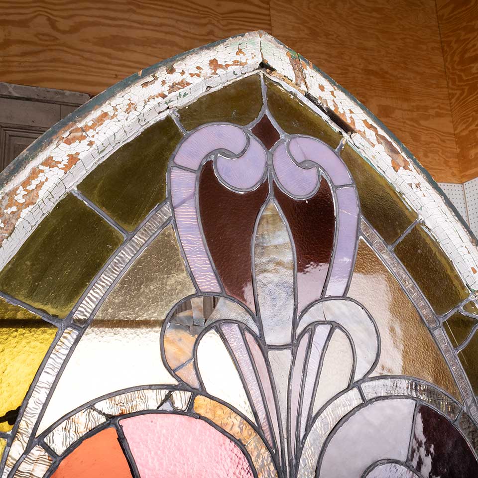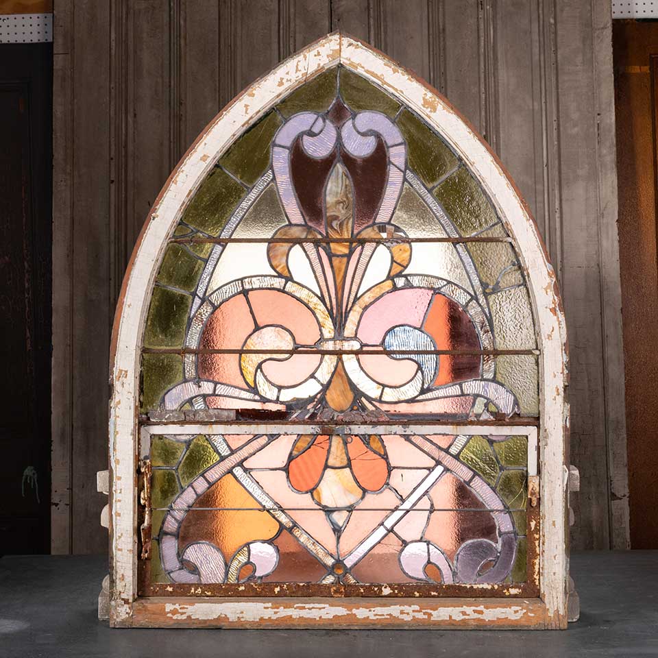 Architectural salvage antique pointed arch top wood framed stained glass window measuring approx. 3" wide x 46 1/2" tall x 1 3/4" front to back. There are cracked panes and some missing glass. See photos to evaluate condition.
