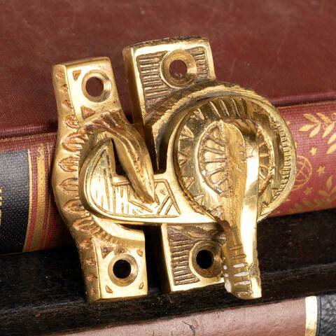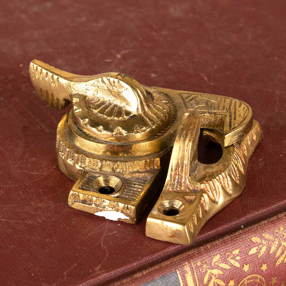 Architectural salvage Victorian style operable ornate brass double hung window sash lock and keeper hardware set. The lock measures approx. 2" wide x 1 1/4" tall x 1" front to back and the keeper 2" wide x 3/4" tall x 3/4" front to back. Color and condition may vary, see photos to evaluate. Priced at $40/each.