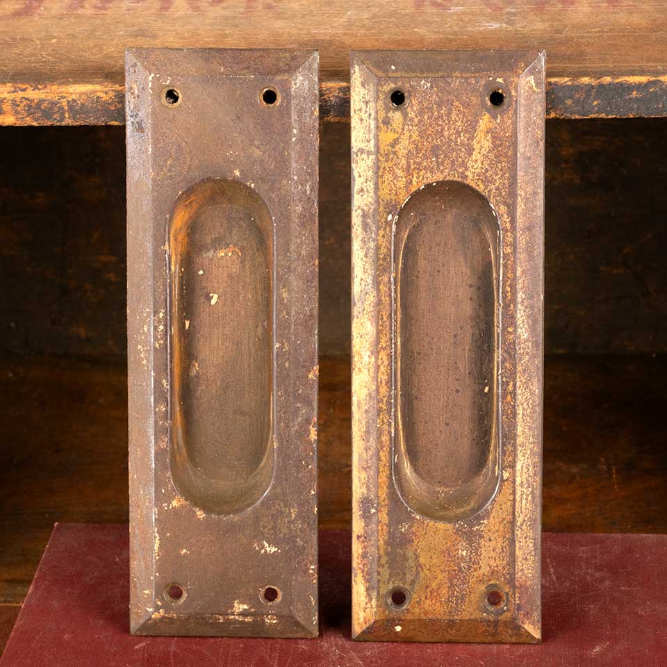 Pair of architectural salvage antique metal pocket door pull handles hardware with beveled edges each measuring approx. 2 1/4" wide x 7 3/8" tall with a recessed area of 1 1/4" x 4". See photos to evaluate condition. Priced at $95 for the pair.