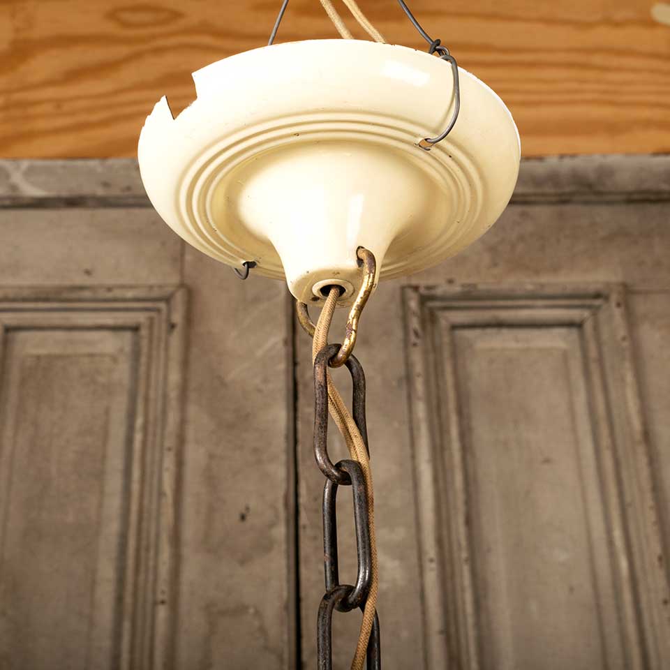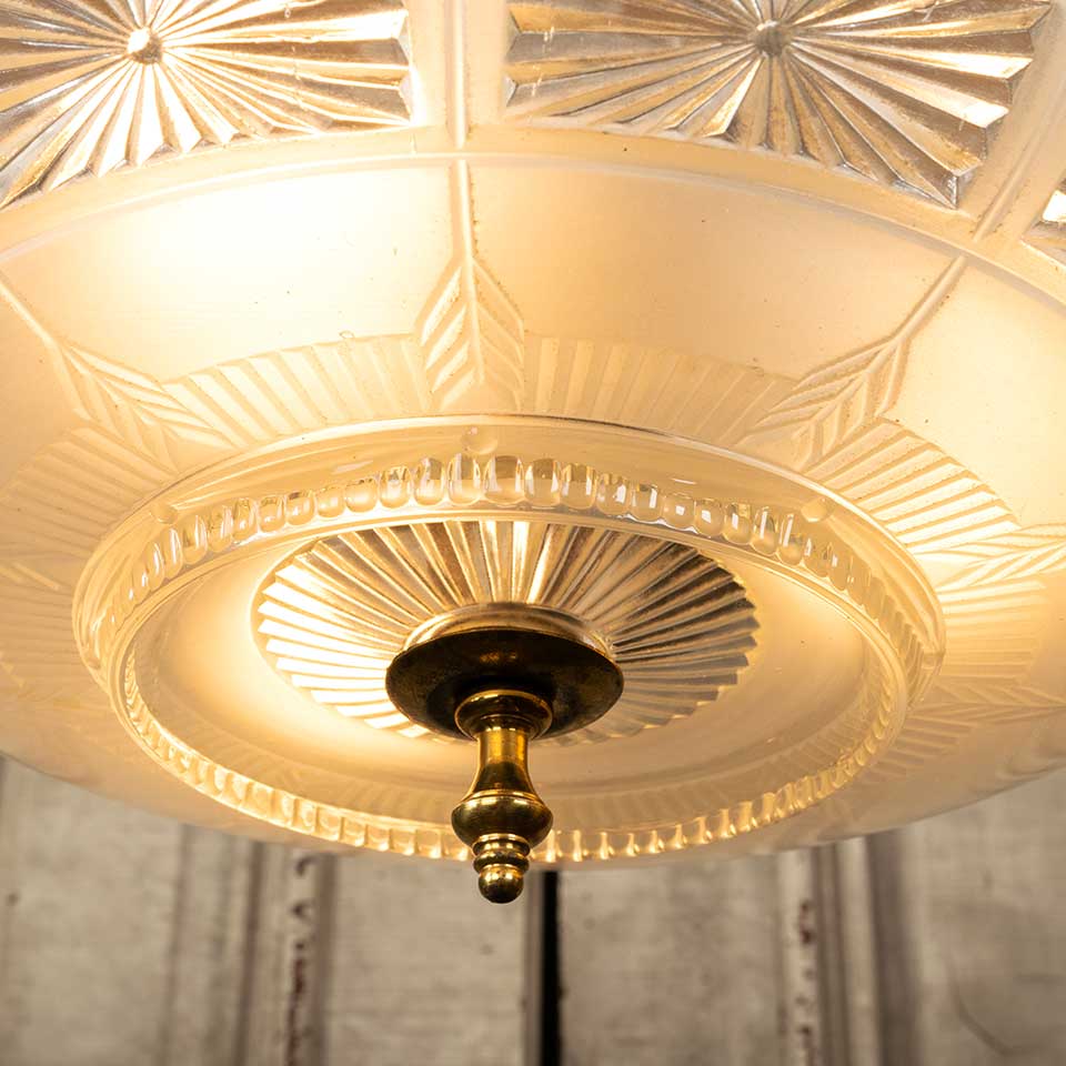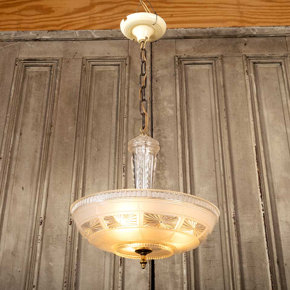 Architectural salvage antique 3 bulb pressed glass chandelier light fixture measuring approx. 15" in diameter x 29" tall. See photos to evaluate condition. Salvaged lighting should be inspected by a licensed electrician prior to installation.