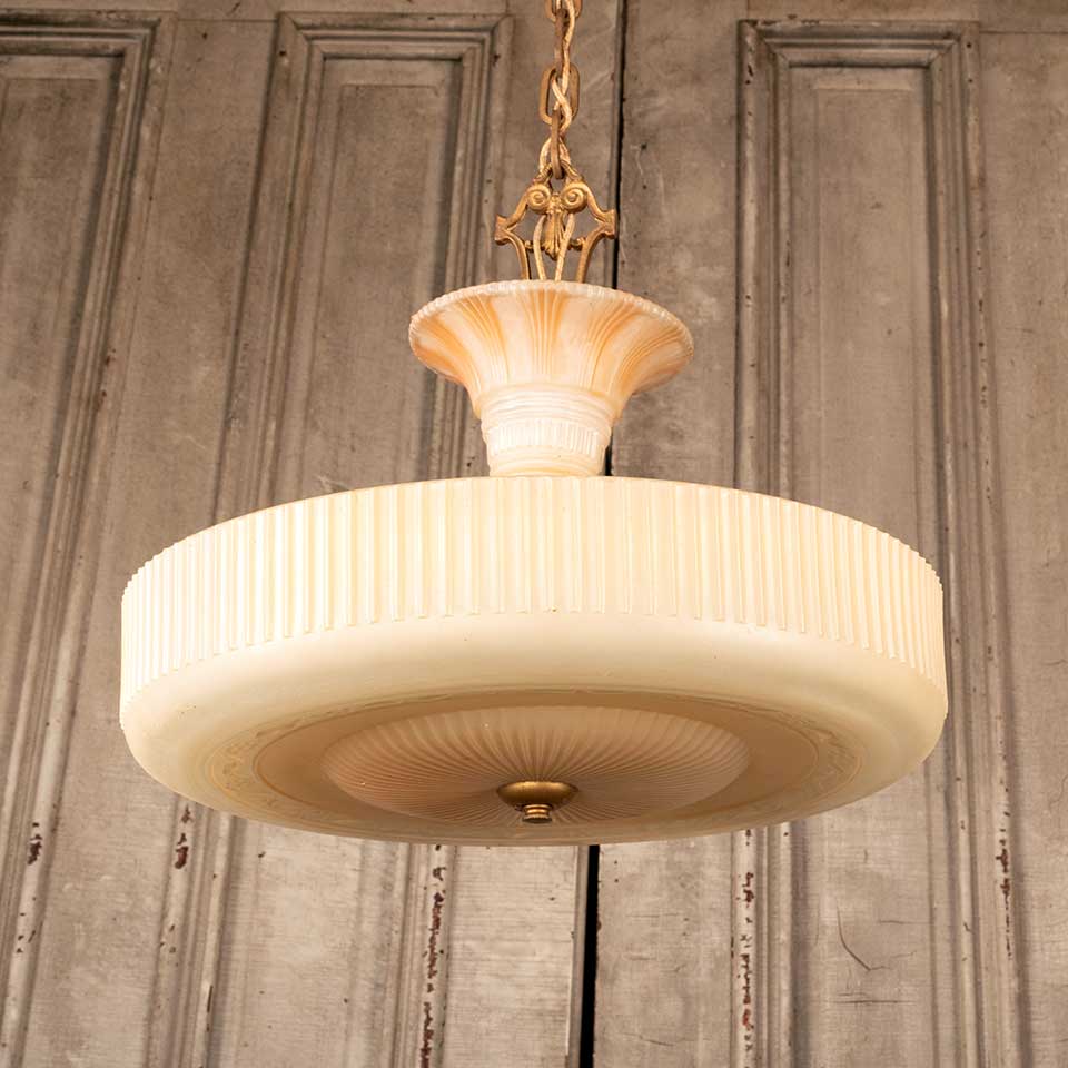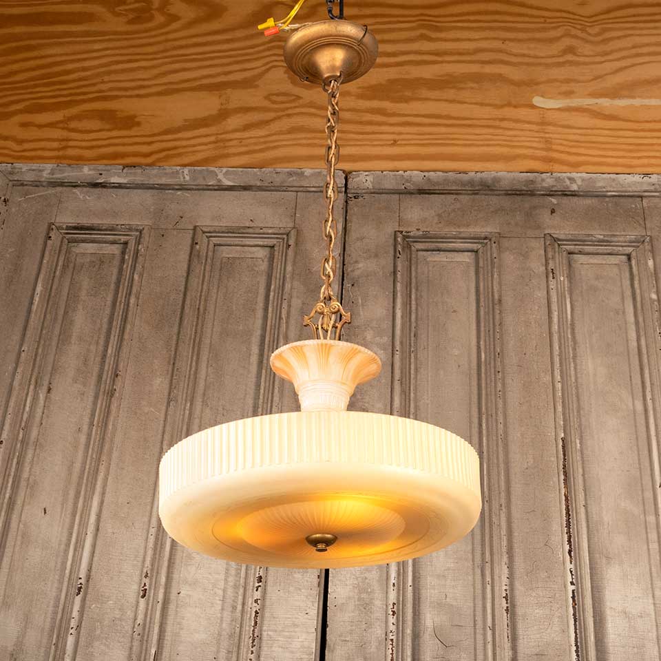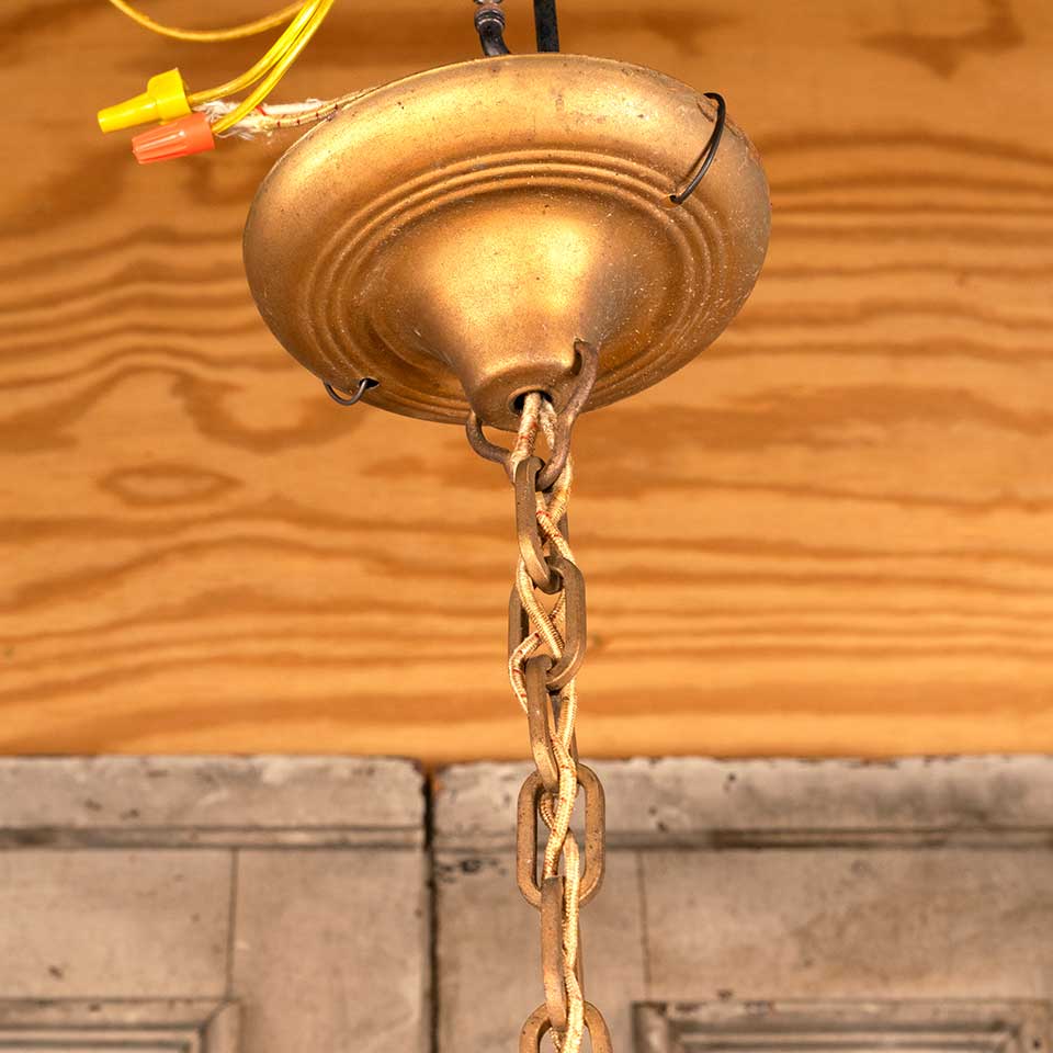 Architectural salvage vintage glass chandelier three bulb light fixture measuring approx. 15 1/2" in diameter x 30" tall. Color and condition may vary, see photos to evaluate. Salvaged lighting should be inspected by a licensed electrician prior to installation.