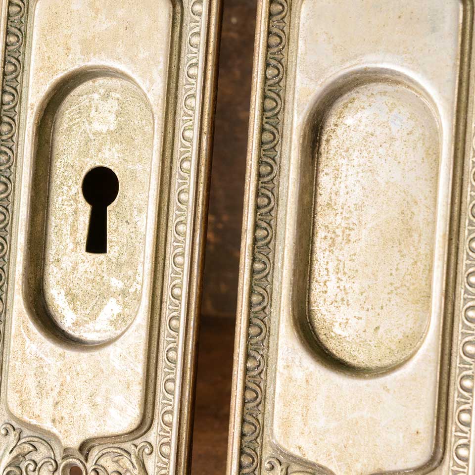 Set of two architectural salvage antique nickel-plated brass Corbin Mantua pattern (c. 1905) pocket door hardware pull handles (one with a keyhole & one without) each measuring approx. 2 5/8" wide x 8 3/4" tall x 1/4" front to back and a recessed area of 1 /3/8" x 3". See photos to evaluate condition. Priced at $175 for the two piece set.