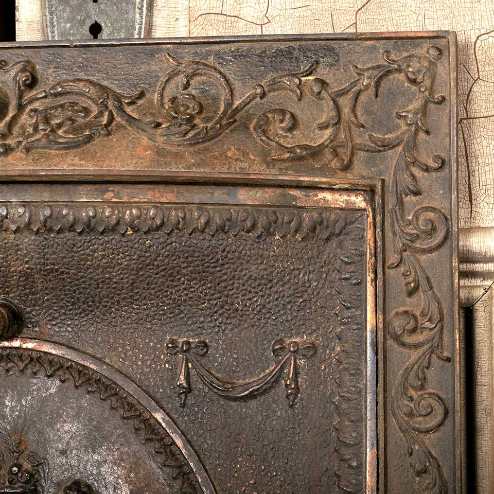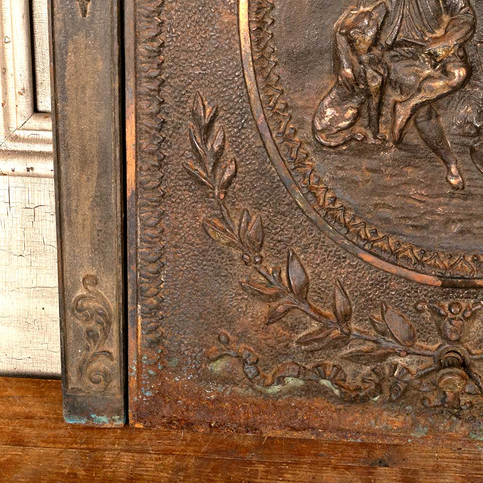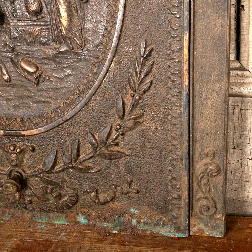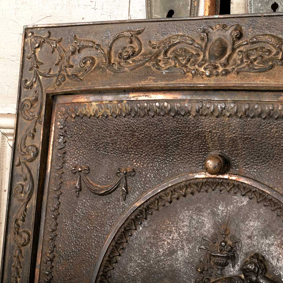 Architectural salvage antique cast iron fireplace surround and summer front cover with figural motif. The surround measures approx. 24 3/8" wide x 30 1/4" tall x 2" front to back and the summer front cover measures approx. 20 1/8" wide x 26 3/8" tall x 1" front to back. There's surface rust at the bottom of the summer front cover. See photos to evaluate condition. Priced at $650 for the 2 piece set.