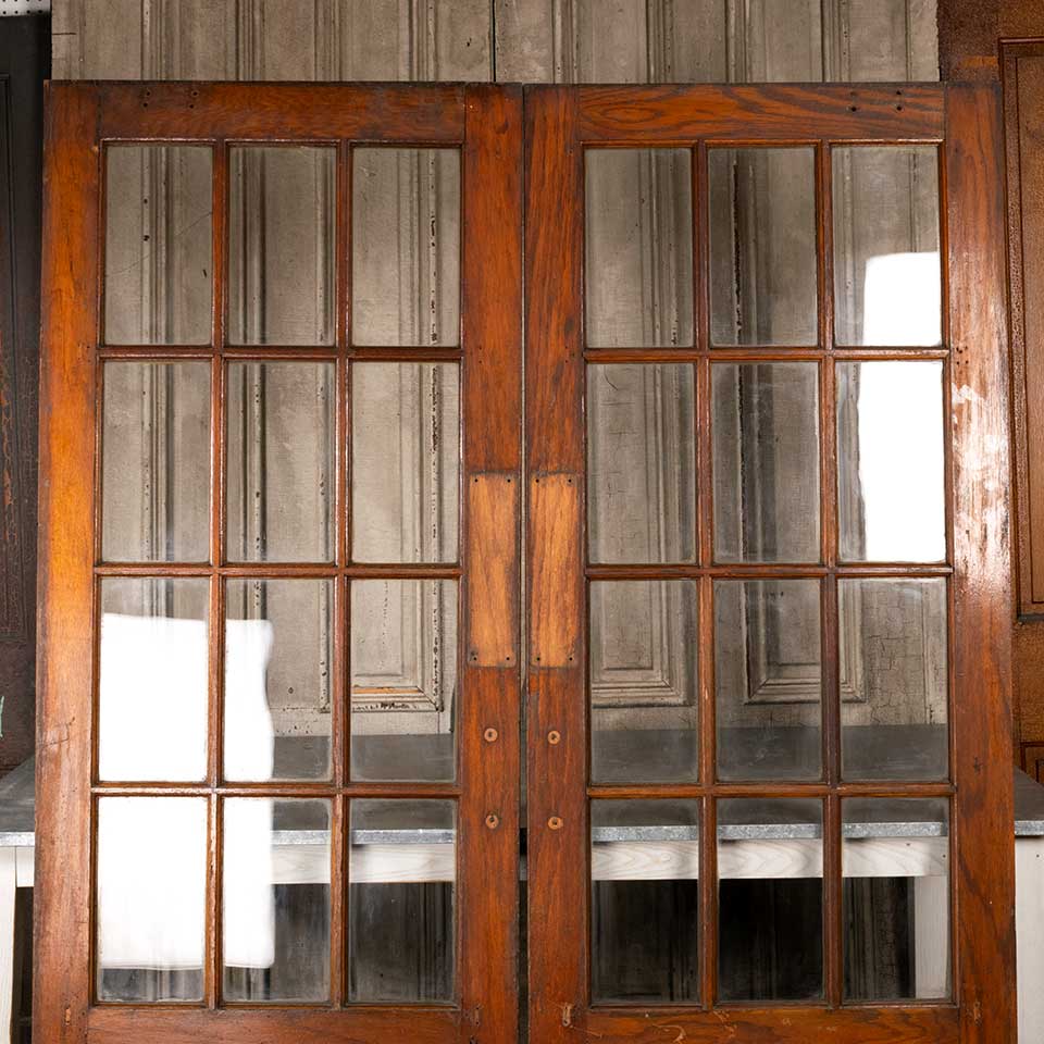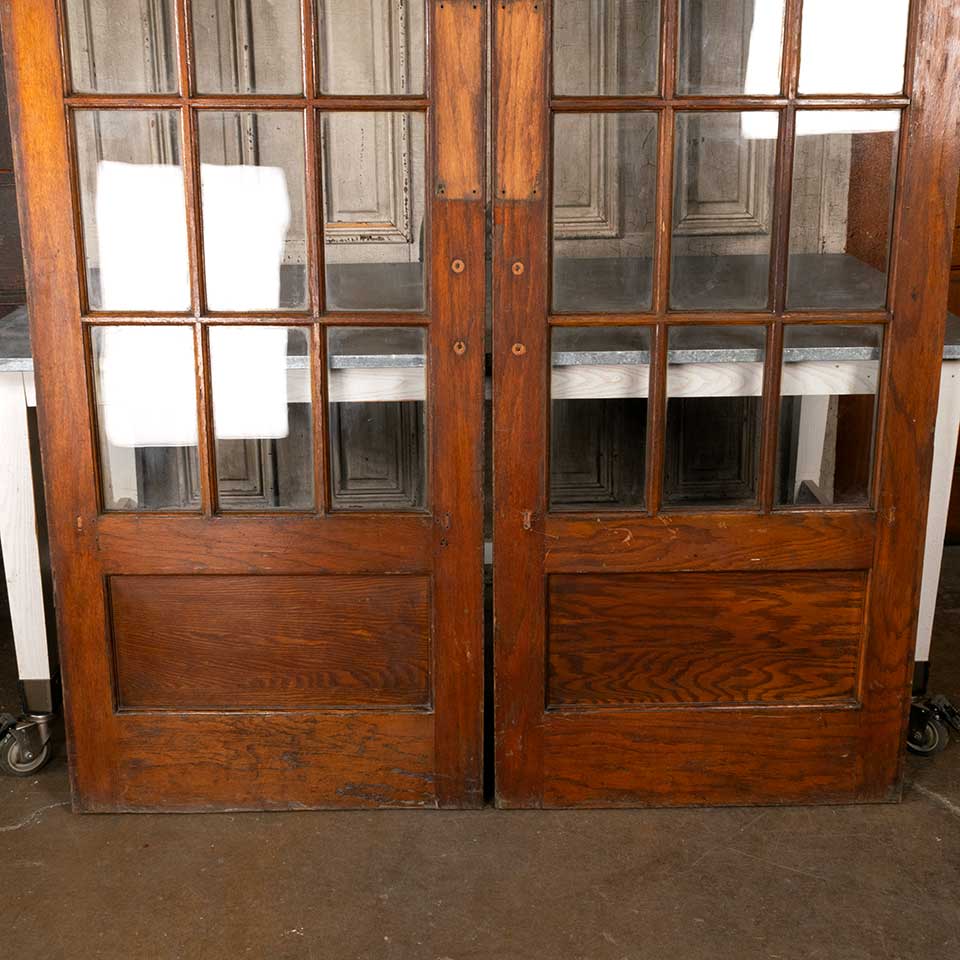 Pair of architectural salvage antique oak twelve lite French doors together measuring approx. 59 3/4" wide x 79 3/8" tall x 1 3/4" thick. There's a cracked pane of glass on one of the doors and holes from hardware. See photos to evaluate condition. Priced at $1,100 for the pair.