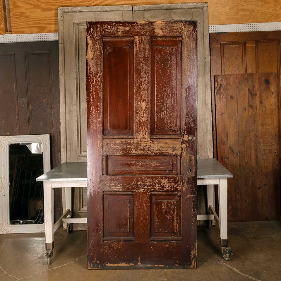Architectural salvage antique five panel wood interior door measuring approx. 39 3/4" wide x 88 5/8" tall x 2" thick. There's some wood loss along the closing edge of the door and a crack in the wood near the mortise lock on one face of the door. See photos to evaluate condition.