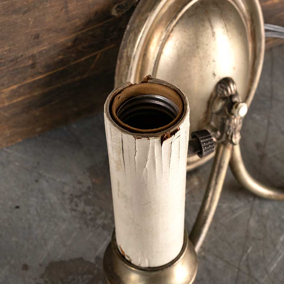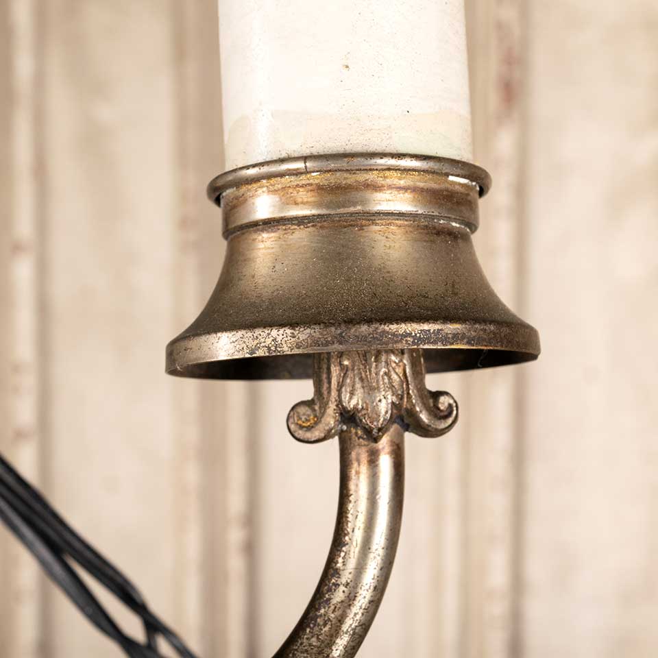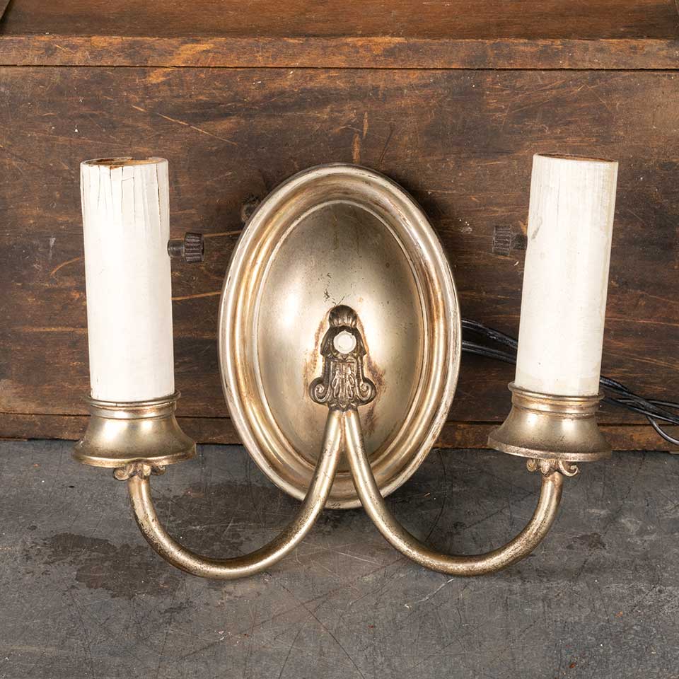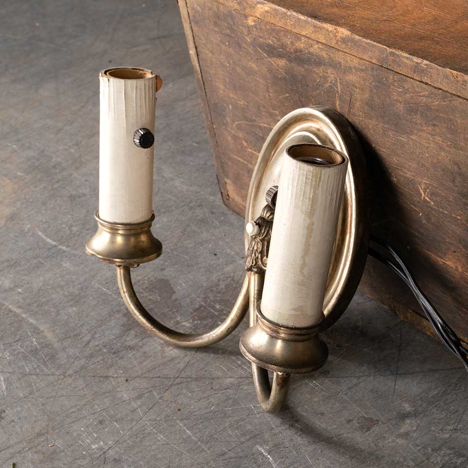 Architectural salvage antique double arm wall sconce light fixture measuring approx. 8 5/8" wide x 7 1/8" tall x 4 1/4" front to back. See photos to evaluate condition. Salvaged lighting should be inspected by a licensed electrician prior to installation.