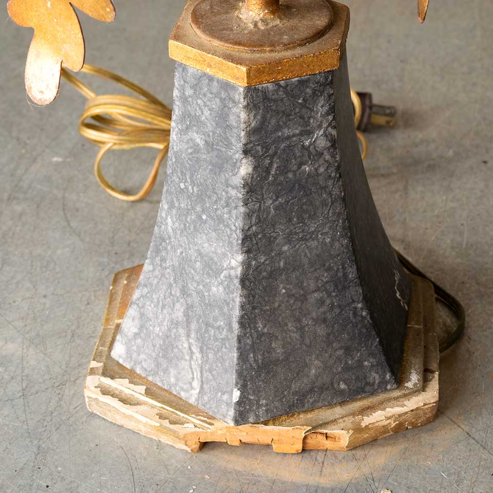 Architectural salvage vintage working lamp with metal flowers measuring approx. 10" in diameter x 38" tall (overall). There's material loss on the base. See photos to evaluate condition. Salvaged lighting should be inspected by a licensed electrician prior to use.