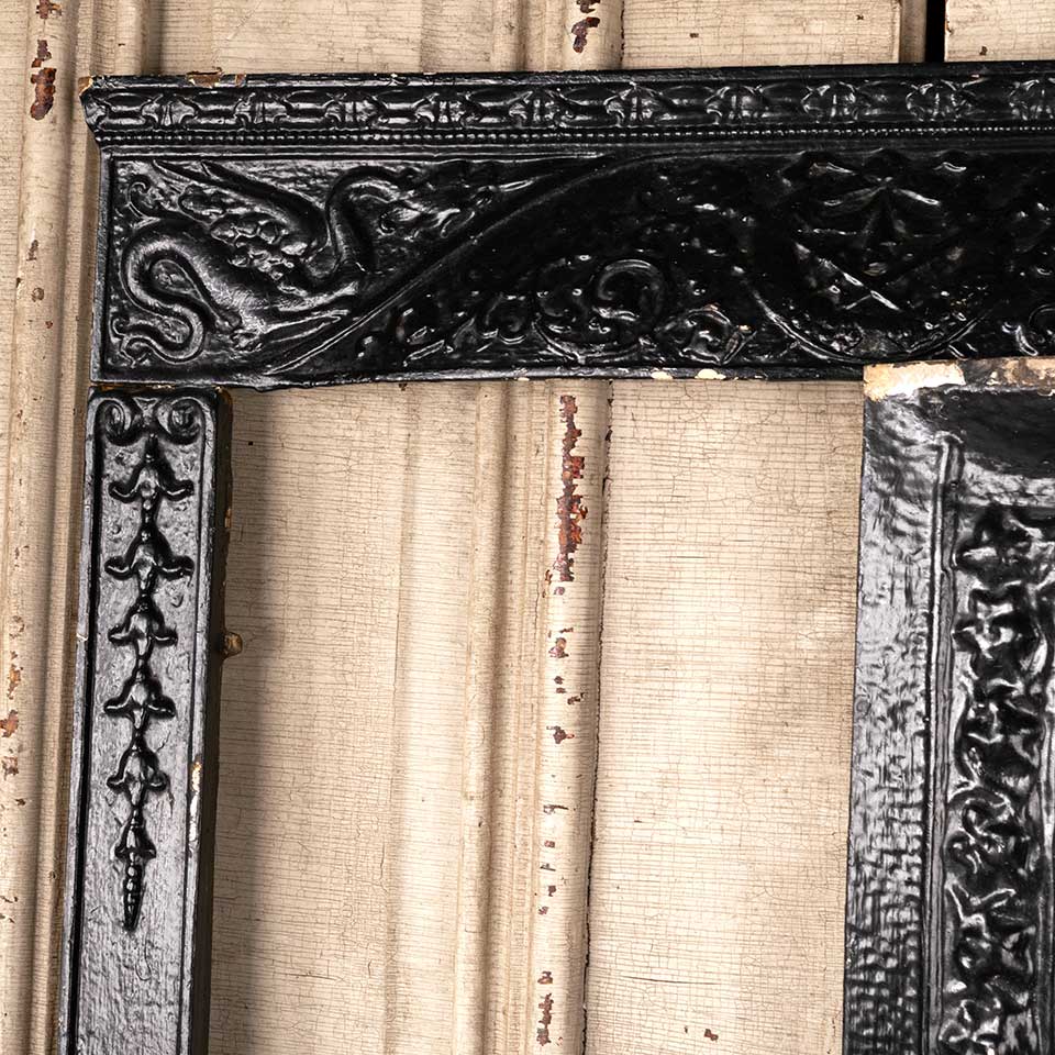 Architectural salvage antique cast iron fireplace surround and stamped / pressed metal summer front cover with figural motif. The surround measures approx. 25 1/4" wide x 30 1/2" tall x 3 1/2" front to back and the summer front cover measures approx. 20 1/8" wide x 26 1/8" tall x 1 5/8" front to back. See photos to evaluate condition. Priced at $475 for the 2 piece set.
