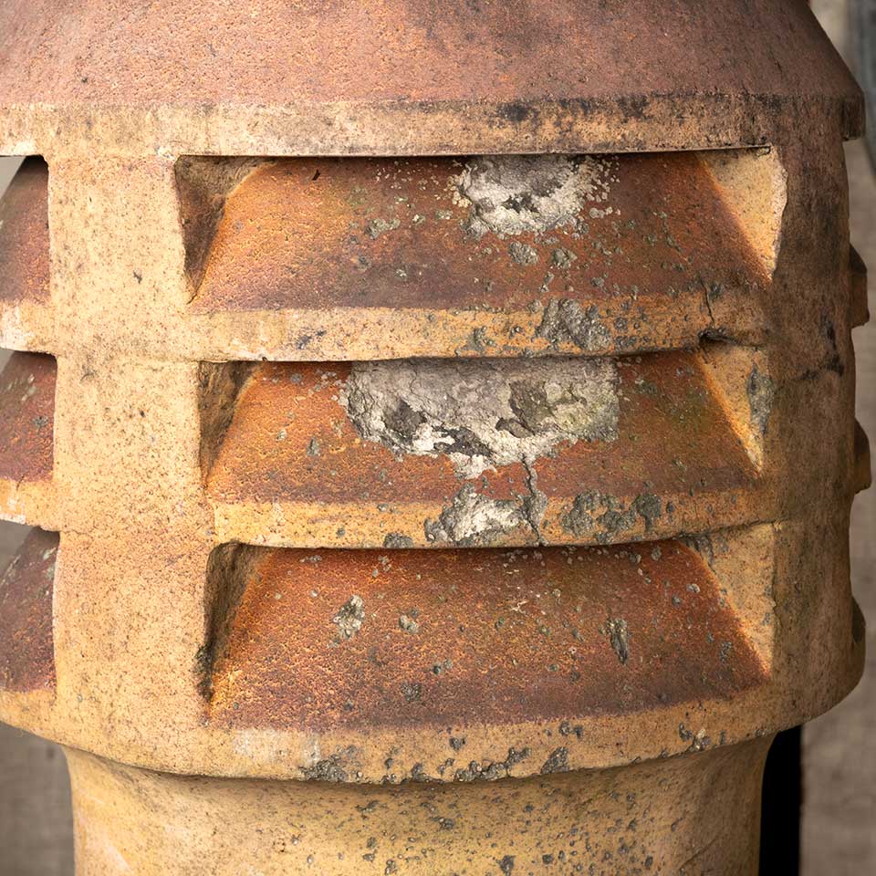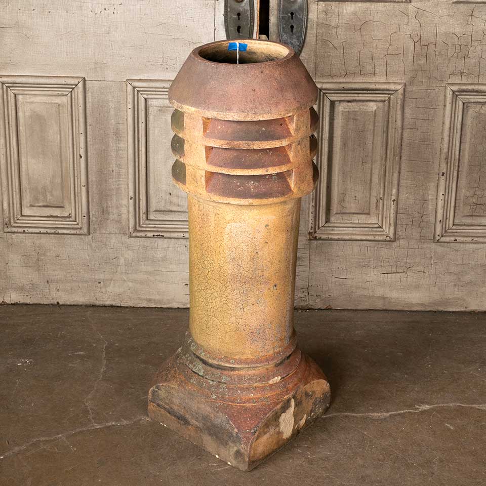 Architectural salvage antique terra cotta louvered top chimney pot measuring approx. 35" tall x 12 1/2" in diameter with a 13" square base. Chimney pots make great garden ornaments! See photos to evaluate condition.