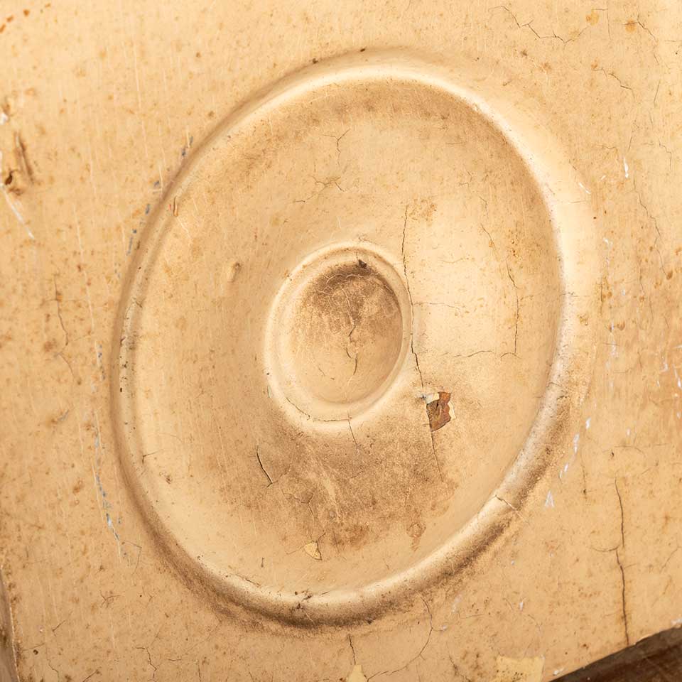 Architectural salvage antique interior window or door painted wood rosette trim block measuring approx. 6" square x 1 1/8" front to back. Color and condition may vary, see photos to evaluate. Priced at $10/each.
