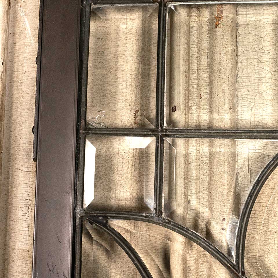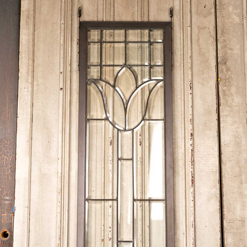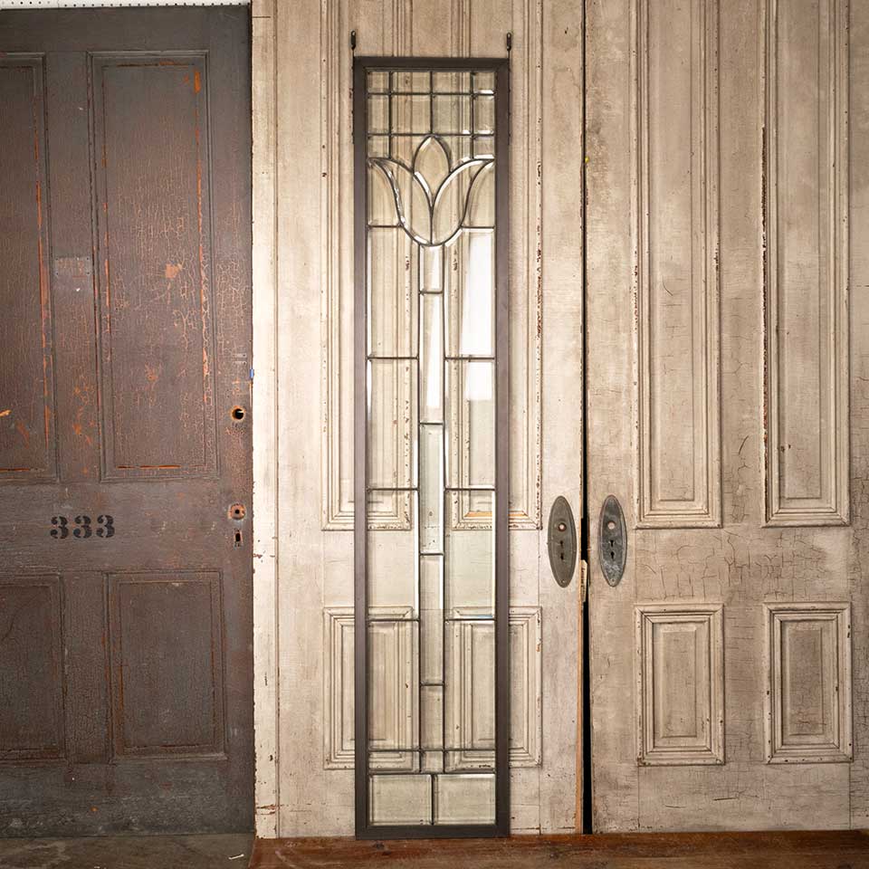 Architectural salvage antique leaded beveled glass side lite window panel with metal frame measuring approx. 17" wide x 86 5/8" tall x 1/2" front to back. One pane is chipped at the corner. See photos to evaluate condition.