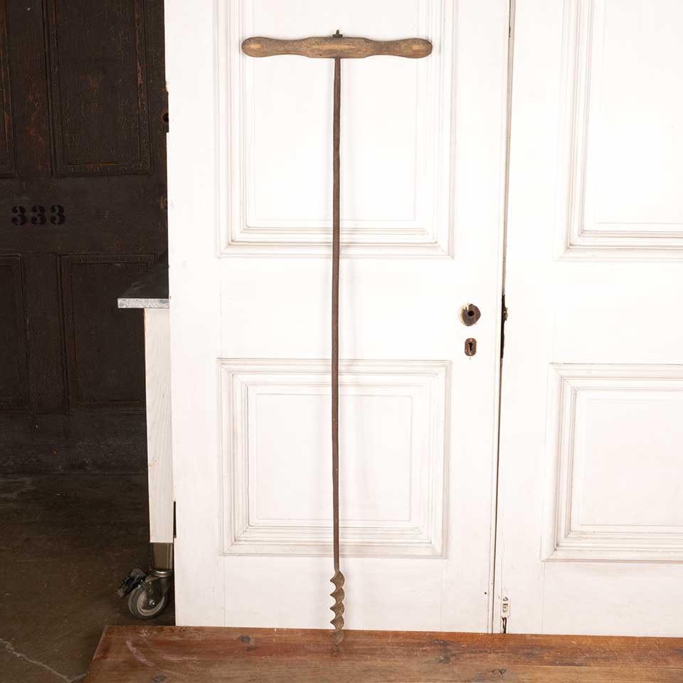 Antique iron barn beam hand auger peg hole drilling tool with wood T- handle measuring approx. 55 1/2" tall (overall) with a 16 1/2" x 1 3/4" handle. See photos to evaluate condition.