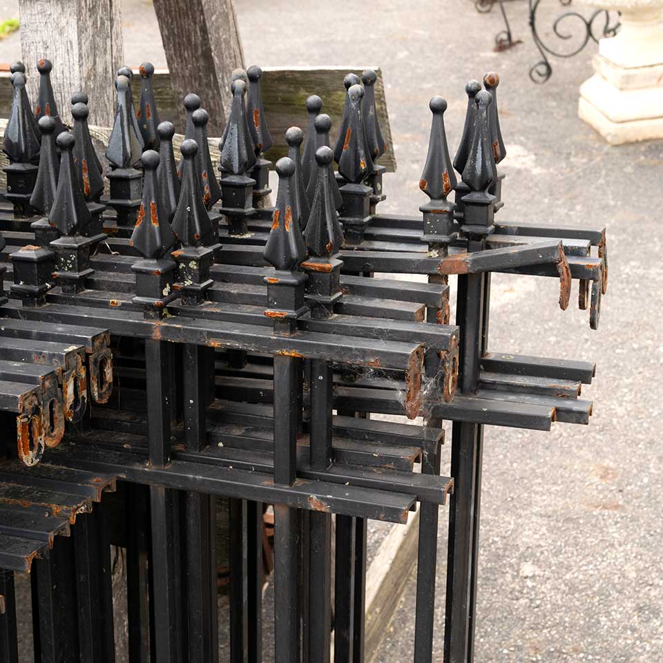 Architectural salvage wrought iron garden gate (31 3/4" wide x 56 1/4" tall x 1" front to back ) and fencing measuring approx. 44" tall with as follows: 2 @ 12" (x 42" tall), 3 @ 49 3/8", 4 @ 51 1/2", 5 @ 71 5/8", and 3 @ 80 1/2". There are a few finials missing and there are no fence posts included. See photos to evaluate condition. Priced at $3,950 for all the fencing and matching gate.