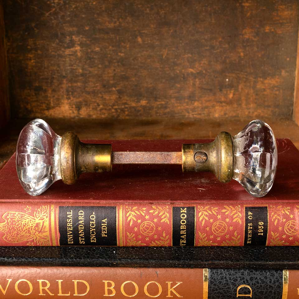 Pair of architectural salvage antique petite octagonal 1 3/4" diameter domed glass and brass doorknobs door hardware with a 5/8" diameter stem. Pair includes a tapped spindle with set screws. Color and condition may vary, see photos to evaluate. Priced at $95/pair.