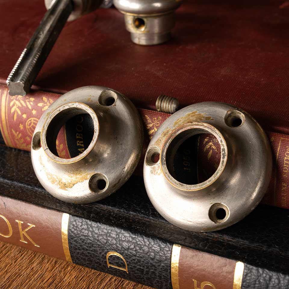 Pair of architectural salvage antique petite octagonal 1 3/4" diameter glass and nickel-plated brass doorknobs door hardware set including a pair of 1 3/4" diameter solid nickel-plated brass rosettes and a threaded spindle with set screws. See photos to evaluate condition.