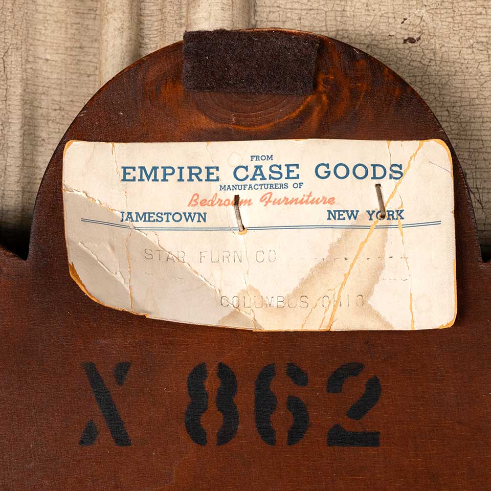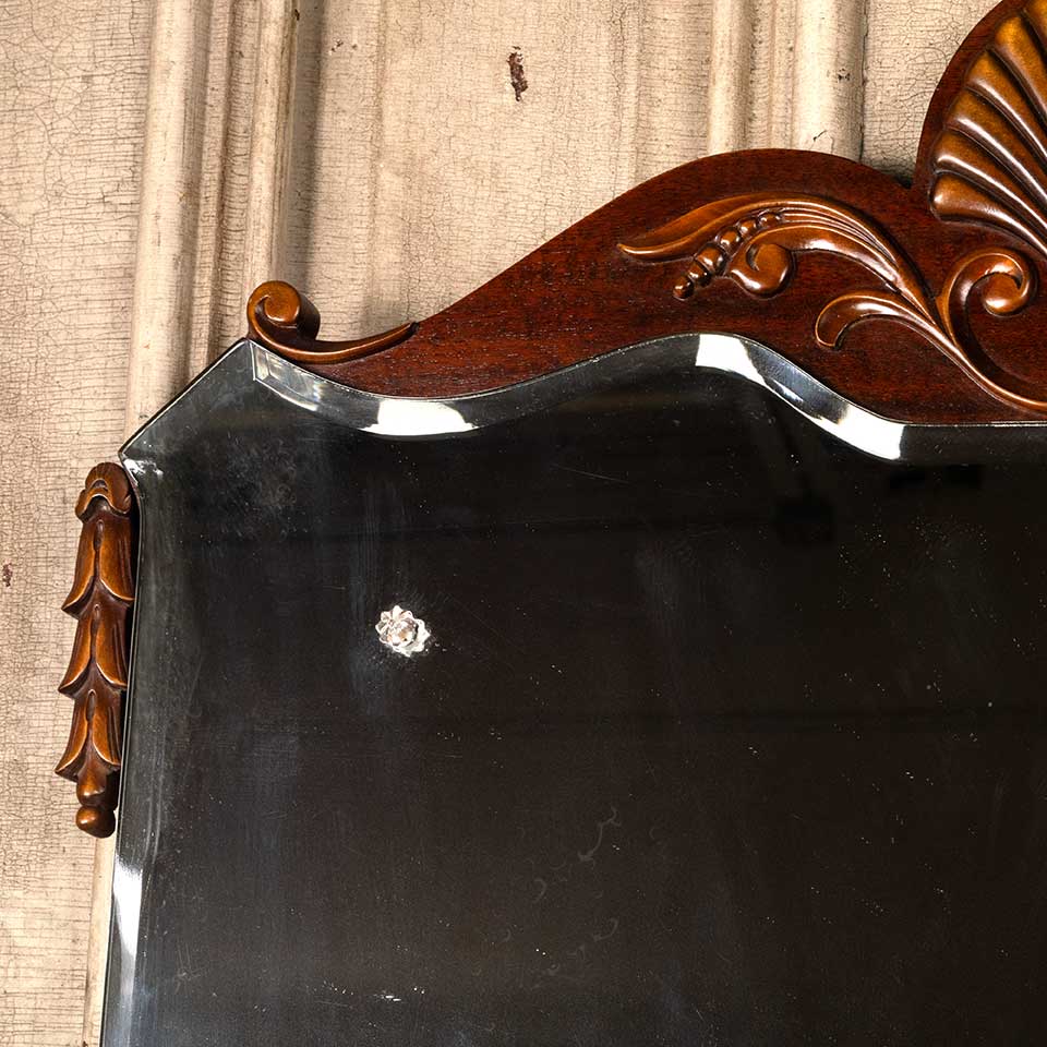 Architectural salvage antique Empire Case Goods beveled glass mirror with with wood pediment measuring approx. 27" wide x 36 1/2" tall x 1" front to back. Original tag on back indicates that this piece was originally sold through Star Furniture Company in Columbus, Ohio. See photos to evaluate condition.