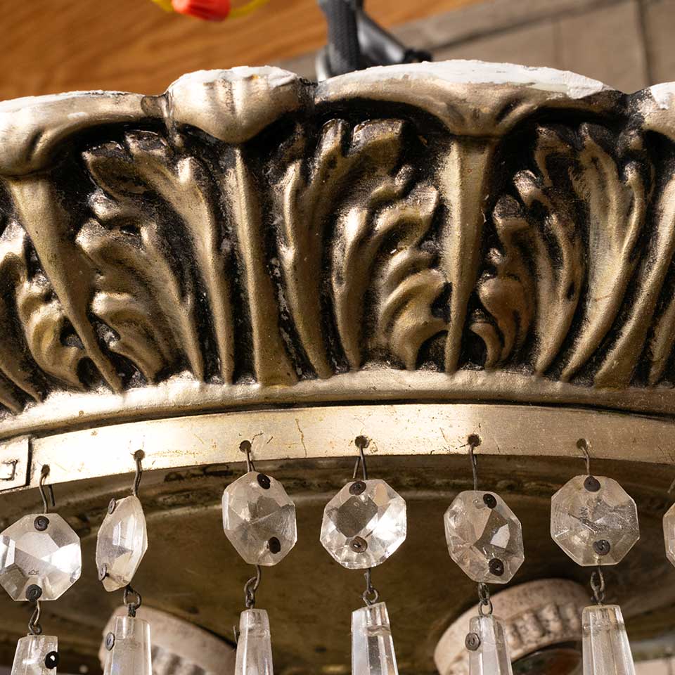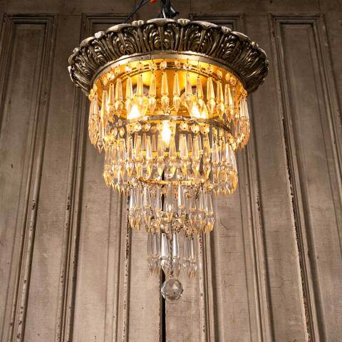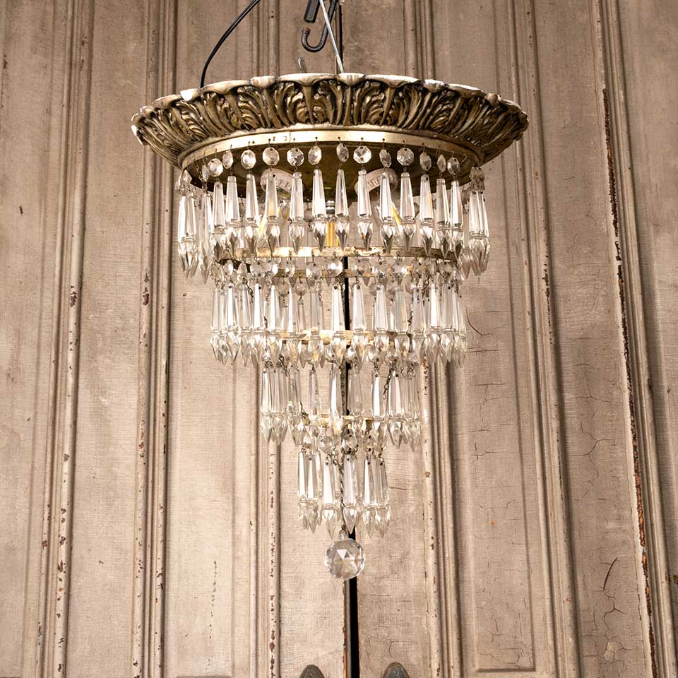 Architectural salvage vintage three light four tier chandelier with glass prisms measuring approx. 16" in diameter x 17" tall. See photos to evaluate condition. Salvaged lighting should be inspected by a licensed electrician prior to installation.