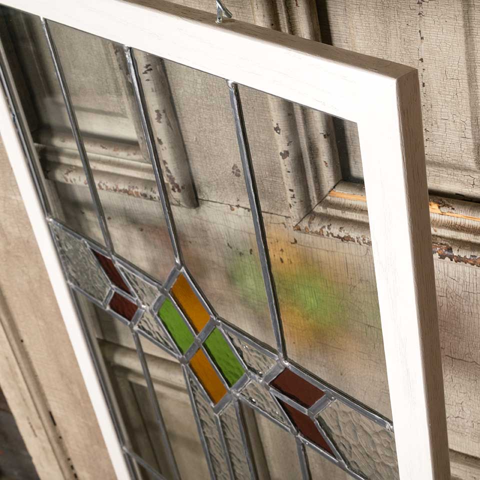 Architectural salvage antique stained and leaded glass window measuring approx. 21 3/4" wide x 42 1/2" tall x 3/4" thick. See photos to evaluate condition.