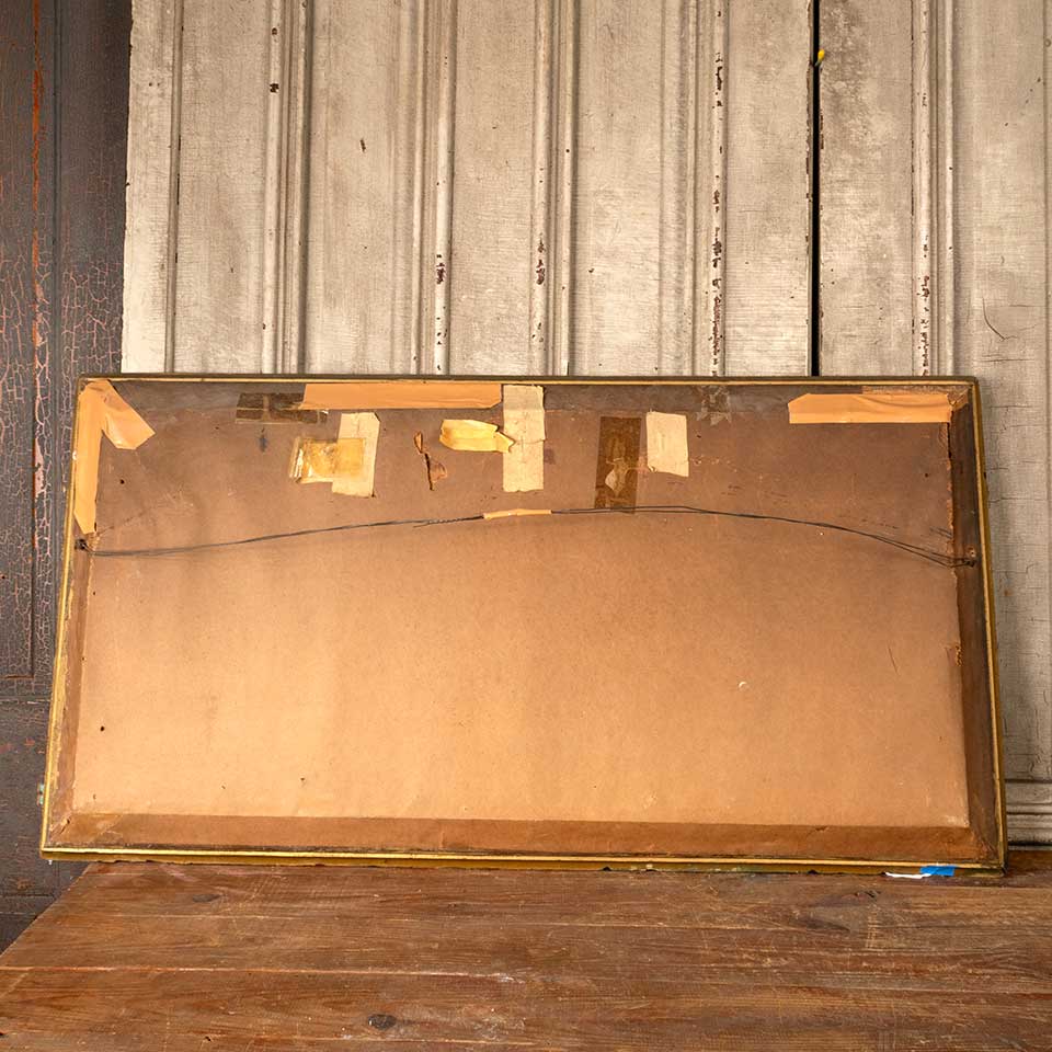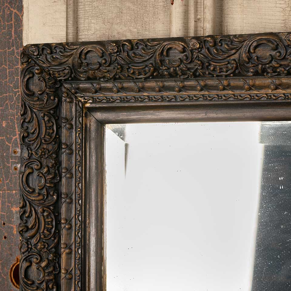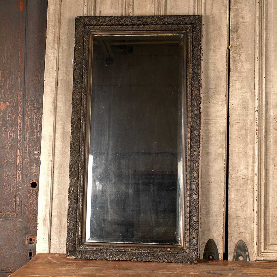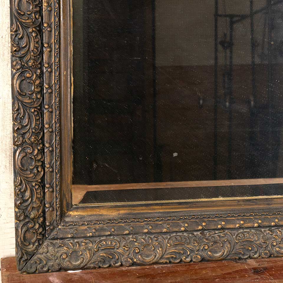 Architectural salvage antique beveled glass mirror in ornate wood frame measuring approx. 46" wide x 24 1/4" tall x 2 1/4" front to back. See photos to evaluate condition.
