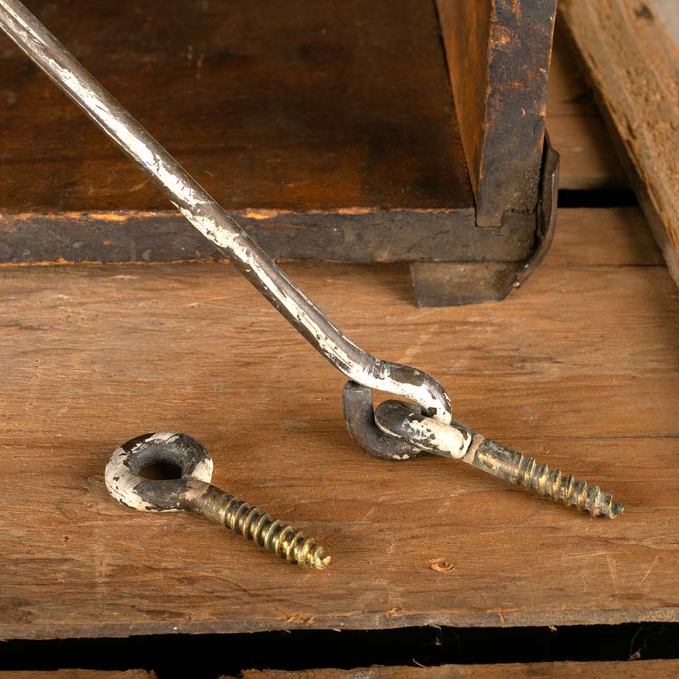 Architectural salvage antique long hook and eye latch hardware measuring approx. 12" long x 1 1/2" tall x 5/8" front to back. Can be used for windows, gates, cabinets, doors, shutters, etc. Color and condition vary. Priced at $25/each.