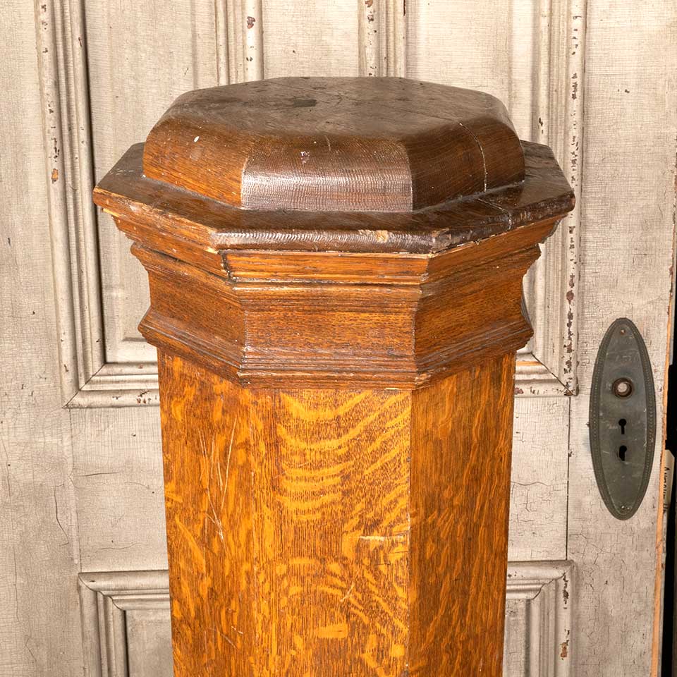 Architectural salvage antique wood staircase newel post measuring approx. 13 1/4" x 13 1/4" x 52 1/2" tall. See photos to evaluate condition.